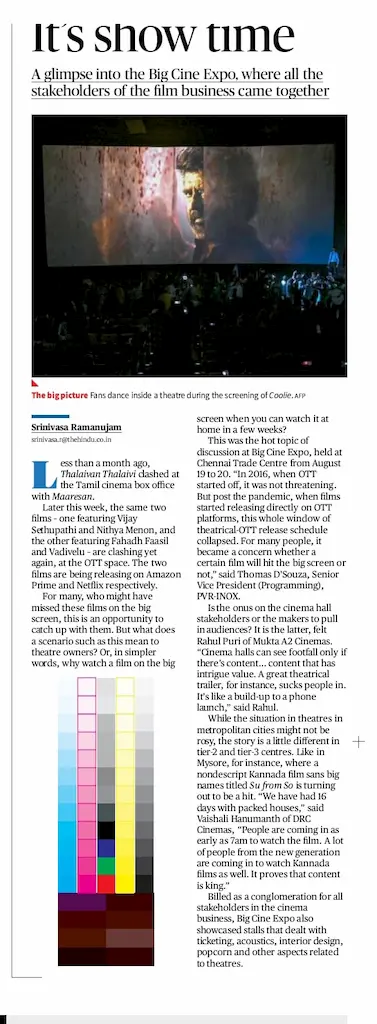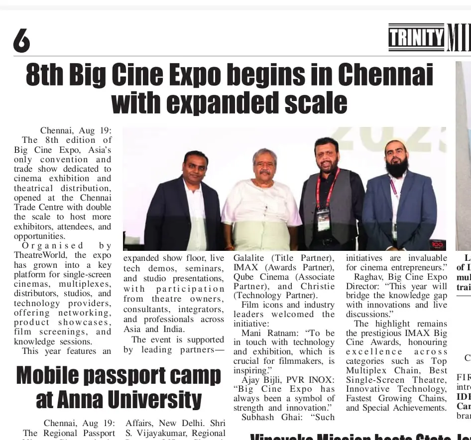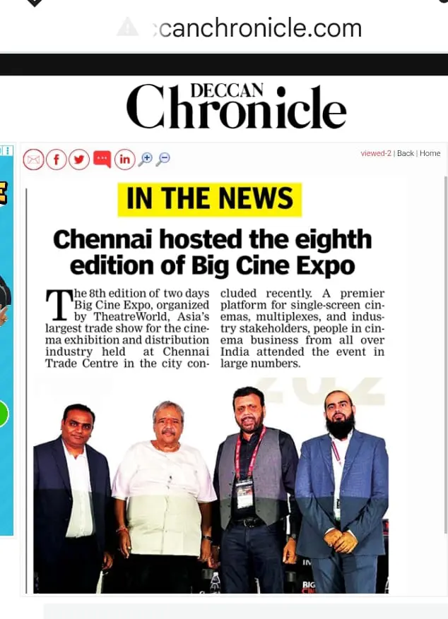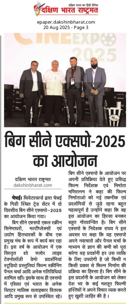 Big Cine Expo 2025, held on August 19–20, 2025 at the Chennai Trade Centre, marked the 8th edition of Asia’s largest convention for cinema exhibition and distribution. Organised by TheatreWorld, the event brought together theatre owners, distributors, studios, technology providers, and industry leaders for two days of networking, innovation, and collaboration. With an expanded show floor, live technology demos, product showcases, film screenings, and the prestigious IMAX Big Cine Awards, the expo reaffirmed its status as the most influential platform for the cinema exhibition industry in Asia.
