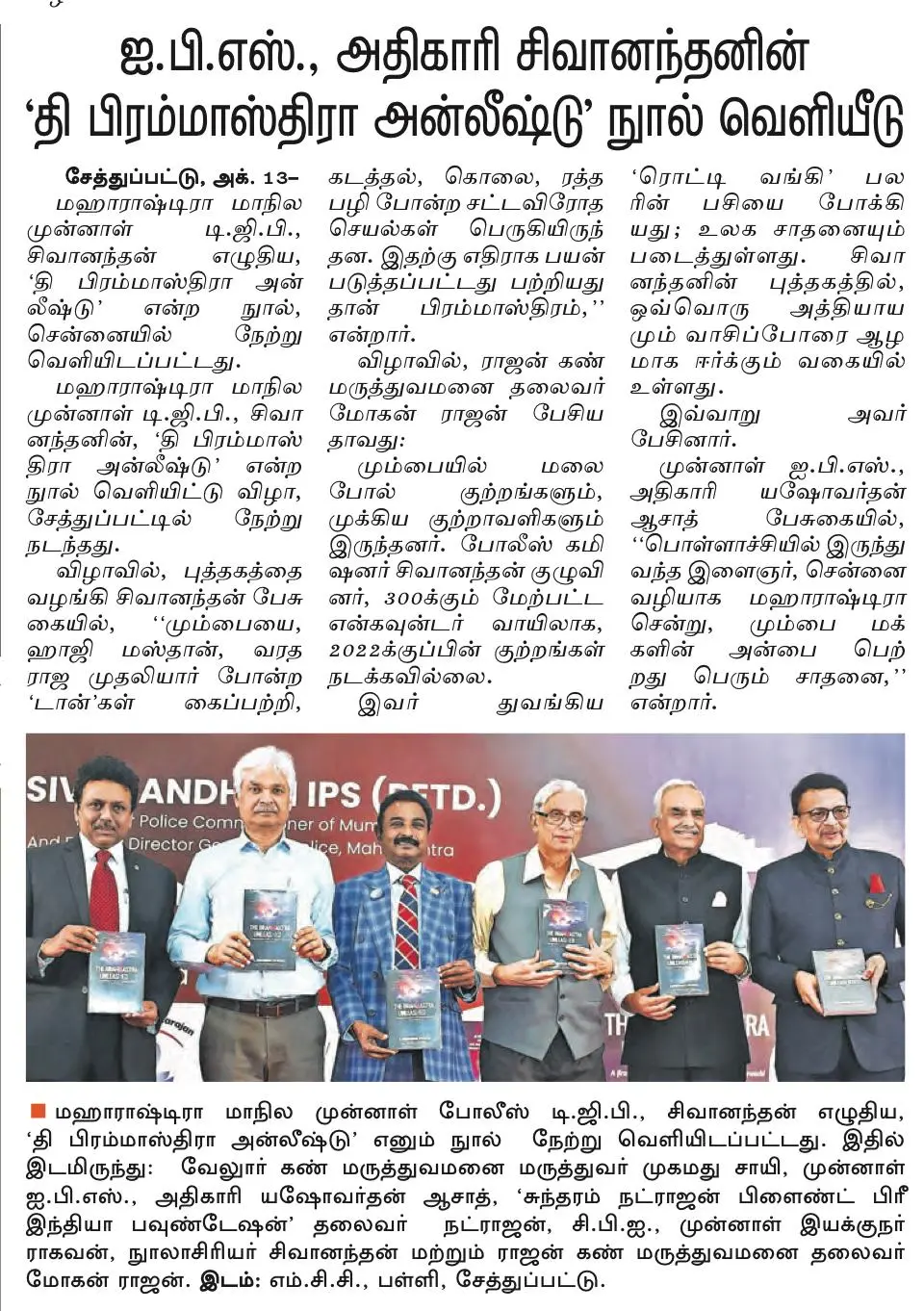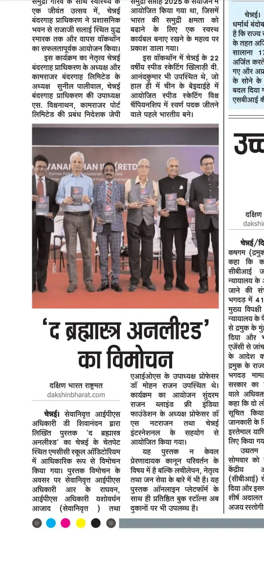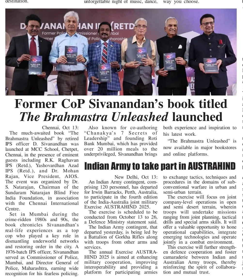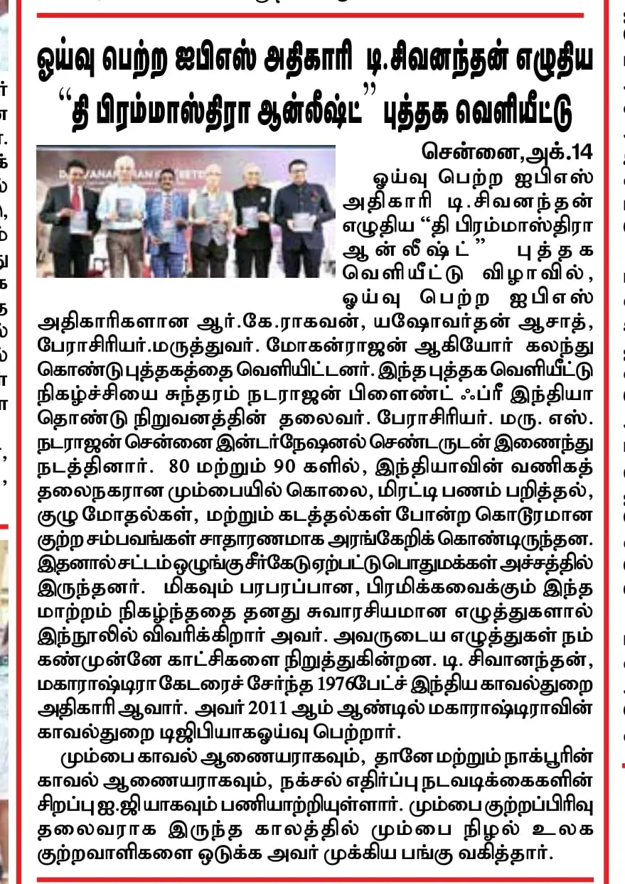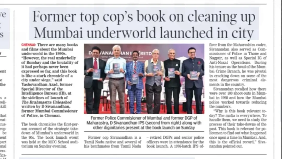 The powerful and inspiring book The Brahmastra Unleashed by retired IPS officer Mr. D. Sivanandhan was officially launched at the MCC School auditorium, Chetpet, Chennai. The event was graced by distinguished guests, including Mr. R.K. Raghavan IPS (Retd), Mr. Yashovardhan Azad IPS (Retd), and Dr. Mohan Rajan, Vice President of AIOS. The launch, jointly organized by Dr. S. Natarajan, Chairman of Sundaram Natarajan Blind Free India Foundation, and the Chennai International Centre, highlighted Mr. Sivanandhan’s remarkable journey and his pivotal role in restoring law and order in Mumbai during the 1980s and 90s.