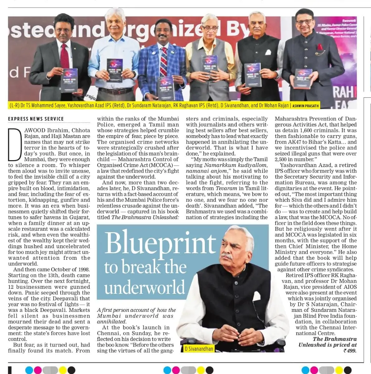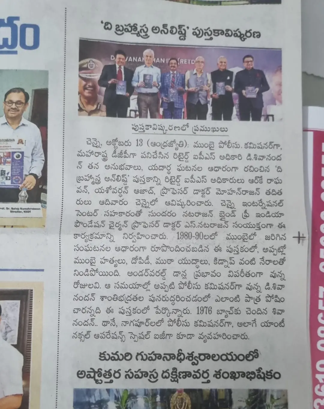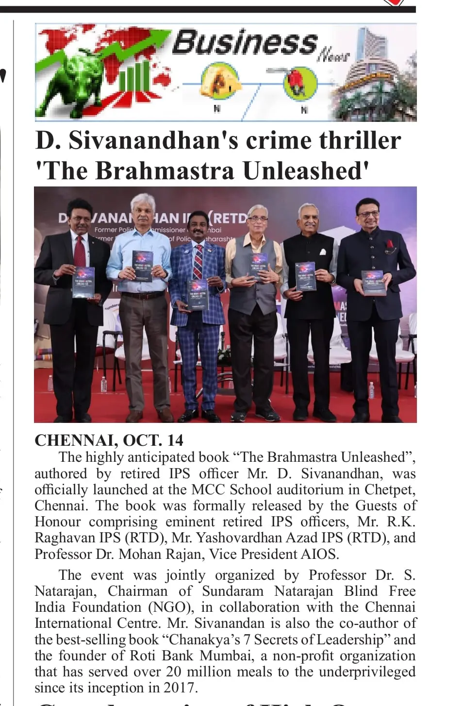 The powerful and inspiring book The Brahmastra Unleashed by retired IPS officer Mr. D. Sivanandhan was officially launched at the MCC School auditorium, Chetpet, Chennai. The event was graced by distinguished guests, including Mr. R.K. Raghavan IPS (Retd), Mr. Yashovardhan Azad IPS (Retd), and Dr. Mohan Rajan, Vice President of AIOS. The launch, jointly organized by Dr. S. Natarajan, Chairman of Sundaram Natarajan Blind Free India Foundation, and the Chennai International Centre, highlighted Mr. Sivanandhan’s remarkable journey and his pivotal role in restoring law and order in Mumbai during the 1980s and 90s.