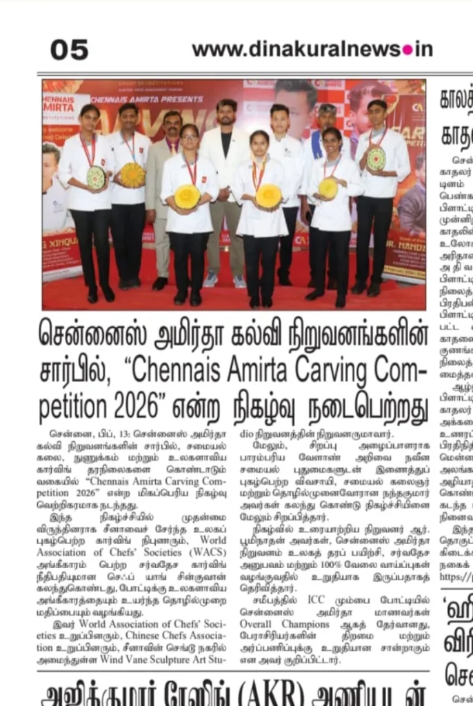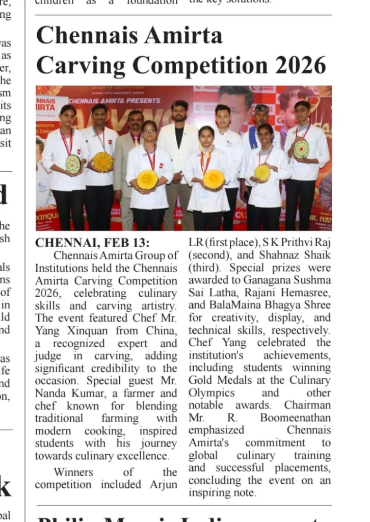 Chennais Amirta Group of Institutions hosted the Chennais Amirta Carving Competition 2026 featuring 40 students across campuses. Chief Guest Chef Yang Xinquan (WACS Certified Judge) conducted an advanced training session and praised students’ international-level precision, creativity, and faculty mentorship. Winners: Arjun LR (1st), S. K. Prithvi Raj (2nd), Shahnaz Shaik (3rd), with special awards to Ganagana Sushma Sai Latha, Rajani Hemasree, and BalaMaina Bhagya Shree. The event also highlighted global achievements including Culinary Olympics gold medals and HOTELEX China Best Overseas Award. Chairman R. Boomeenathan reaffirmed commitment to global training, industry exposure, and placements.