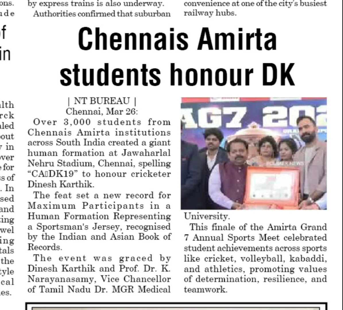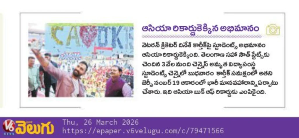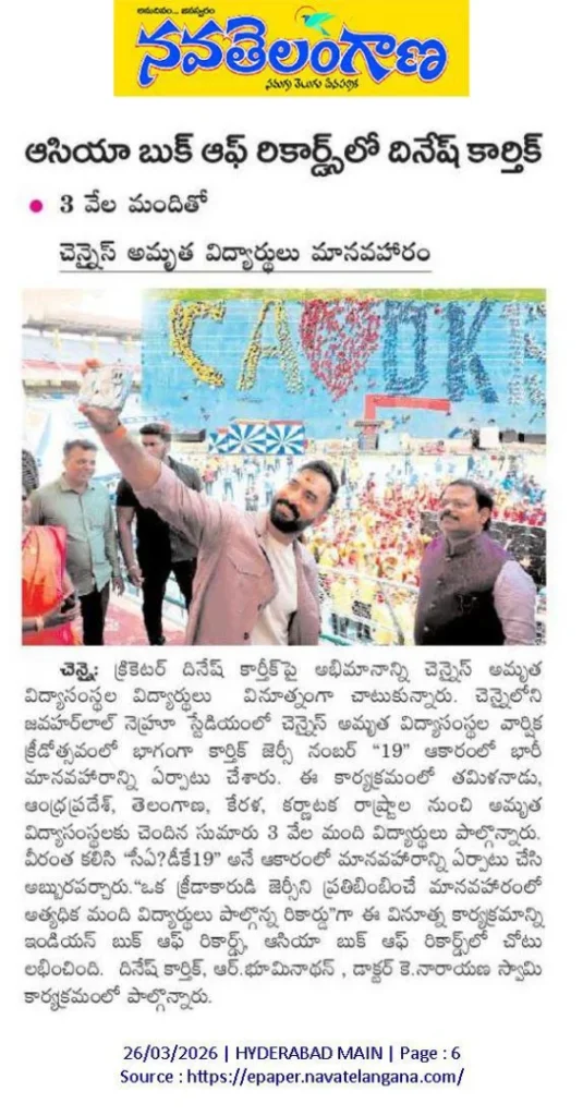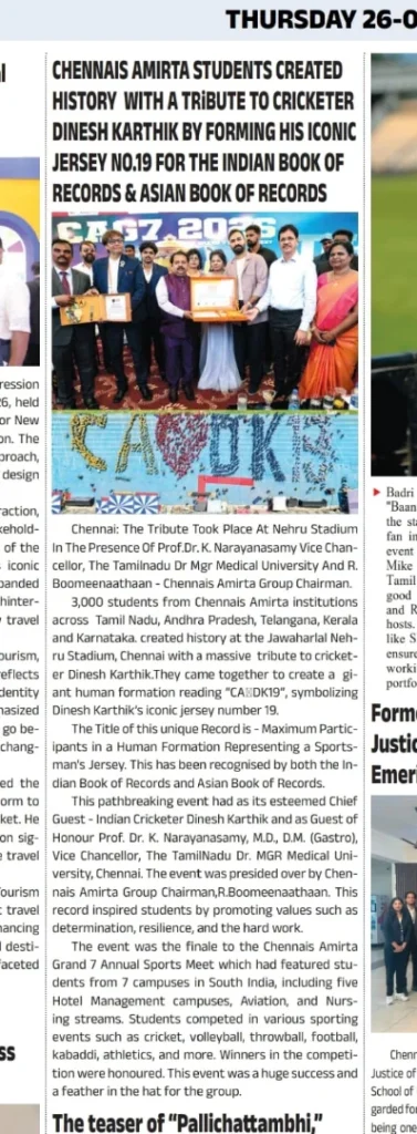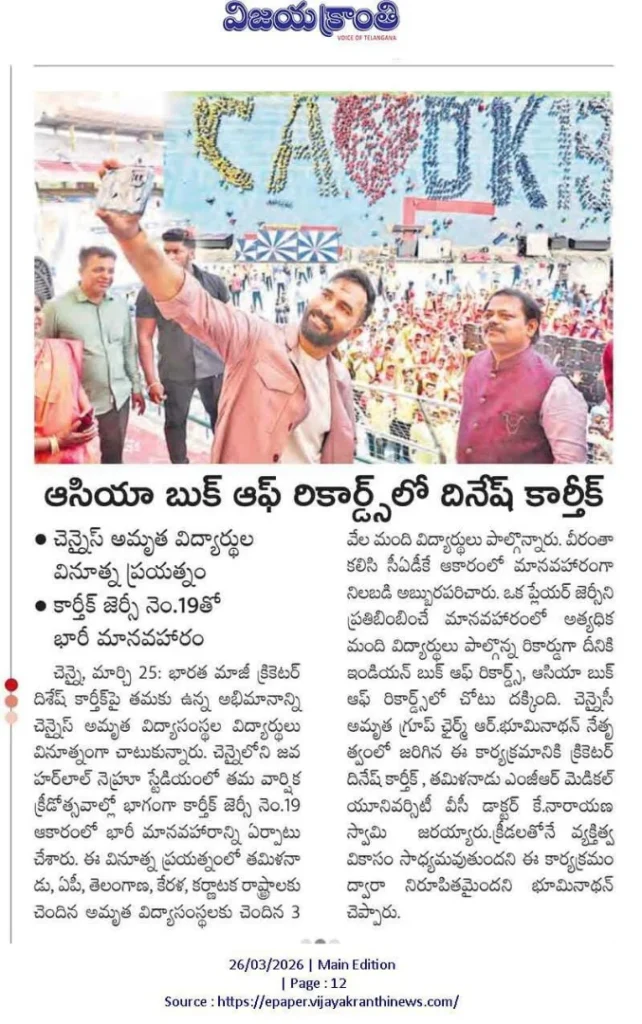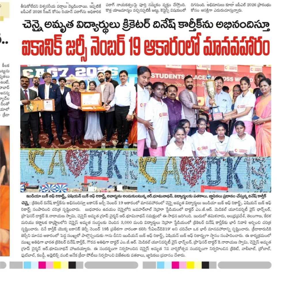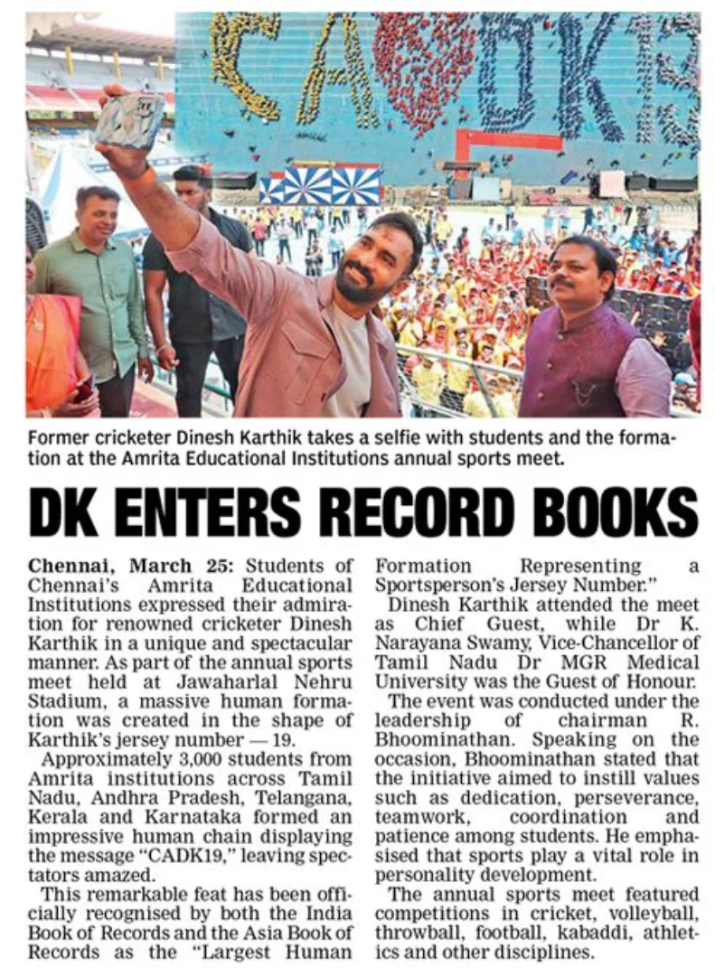 Over 3,000 students from Chennais Amirta institutions united to create a massive human formation reading “CA♡DK19,” honoring Dinesh Karthik’s iconic jersey number.