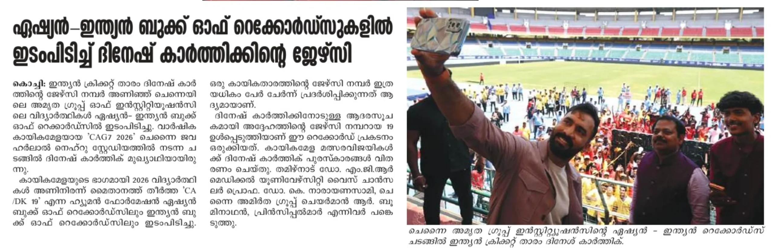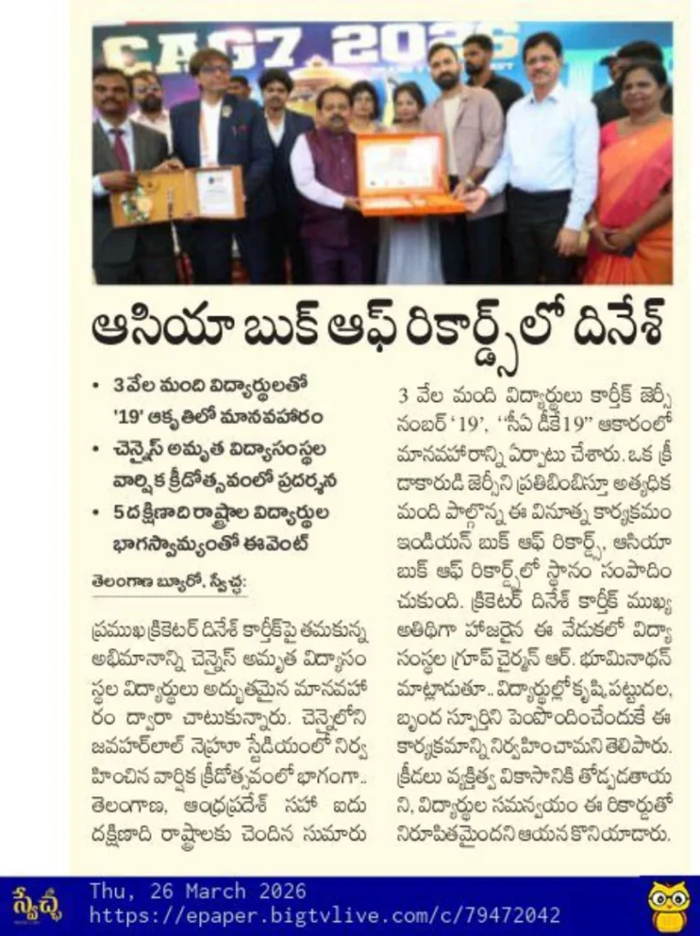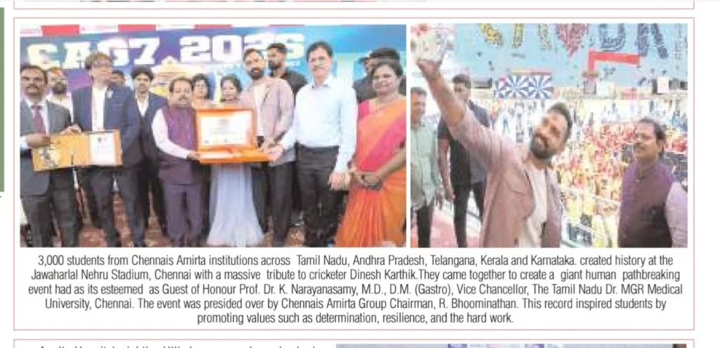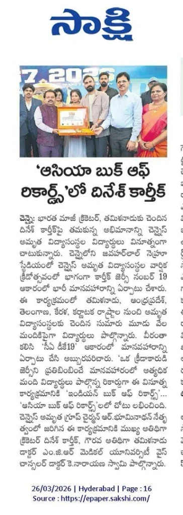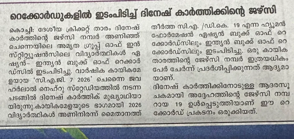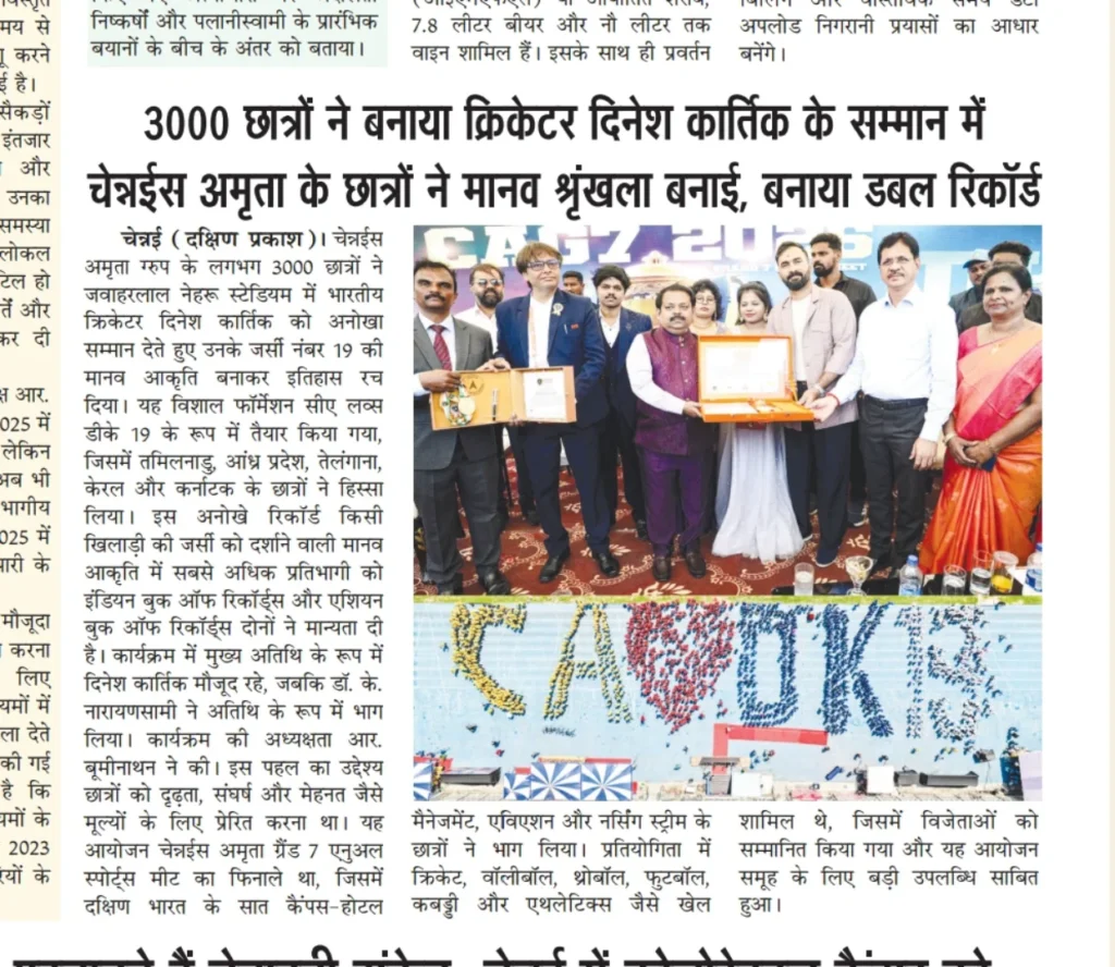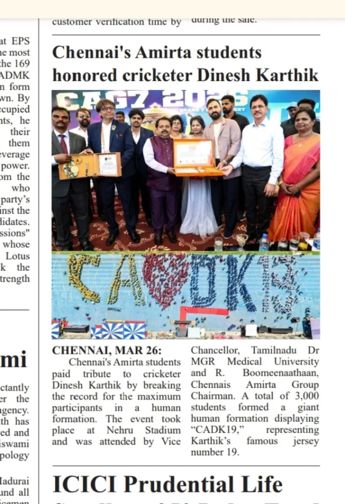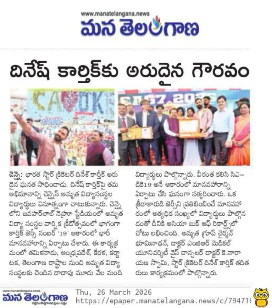 Over 3,000 students from Chennais Amirta institutions united to create a massive human formation reading “CA♡DK19,” honoring Dinesh Karthik’s iconic jersey number.