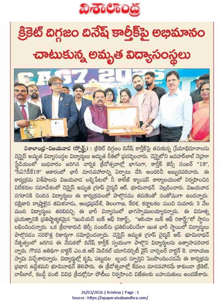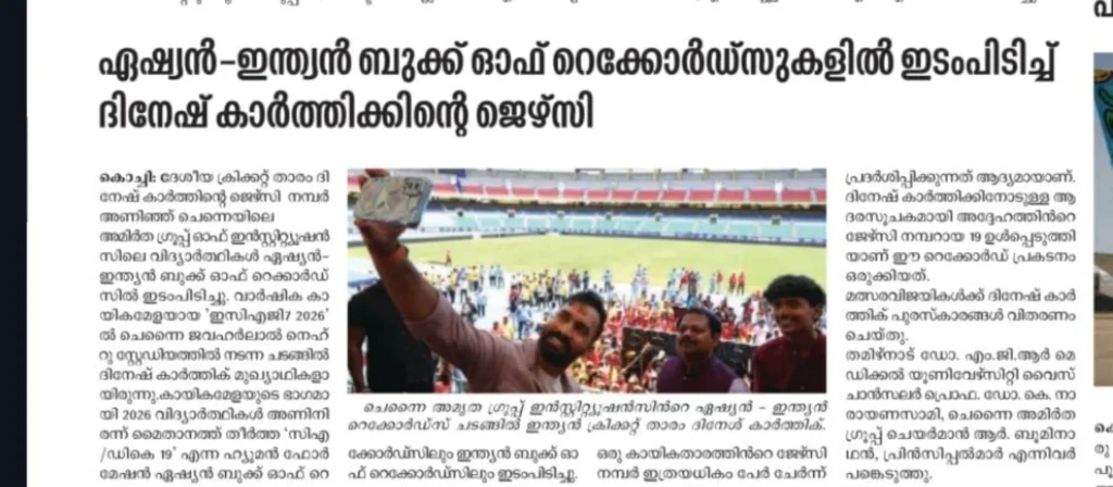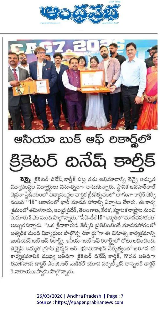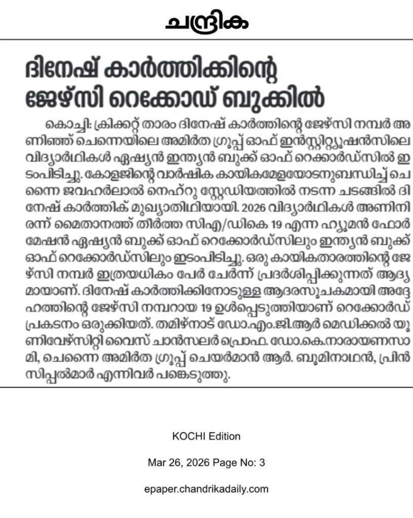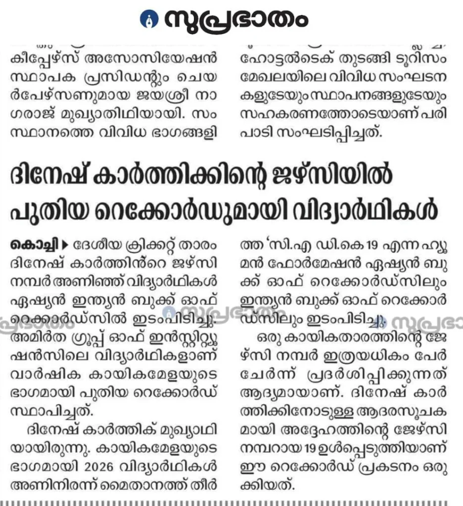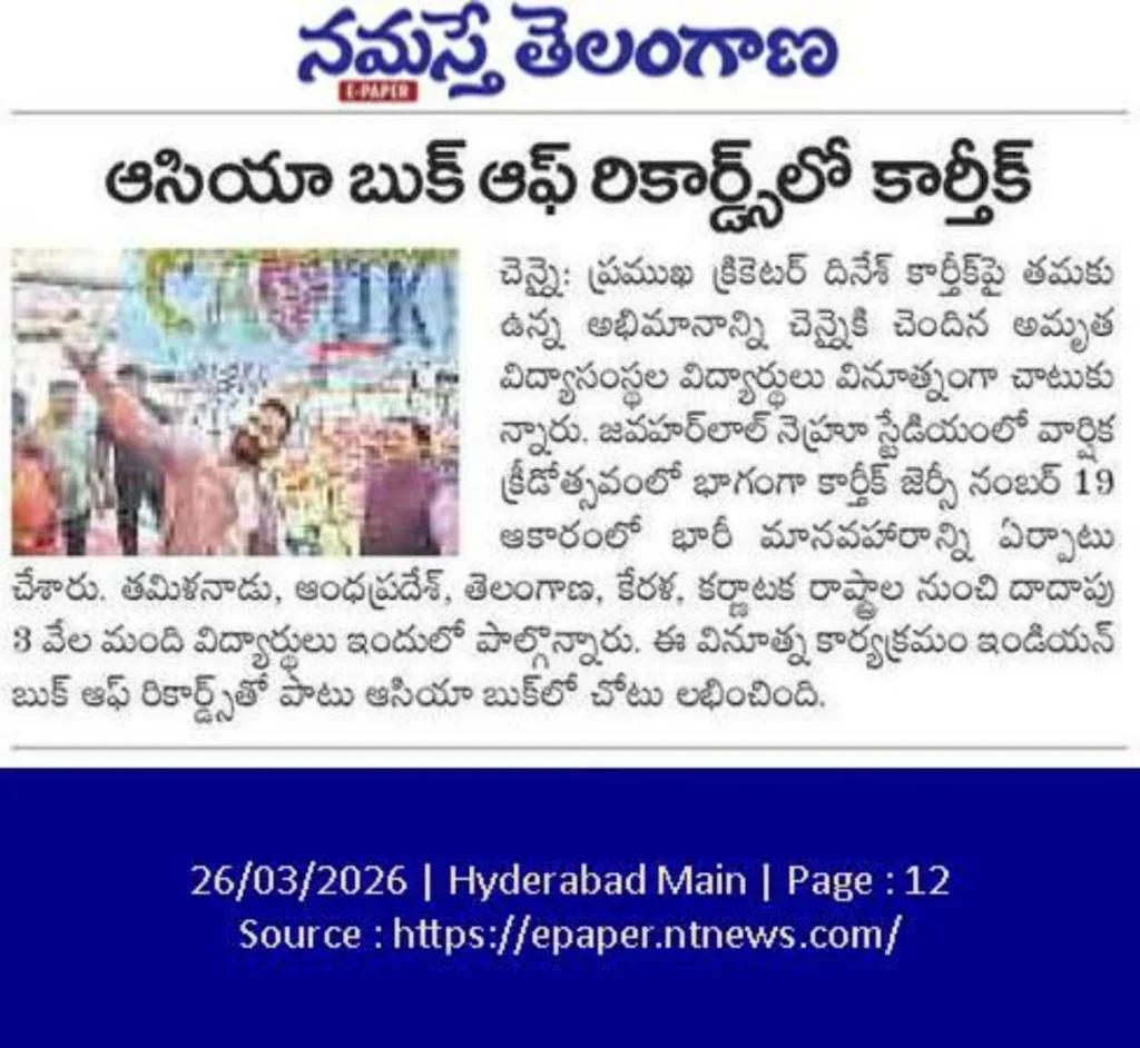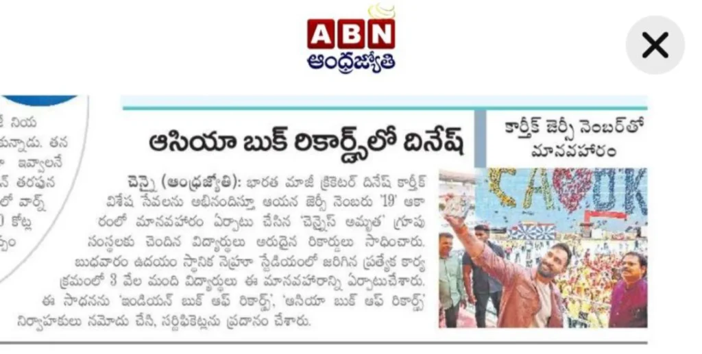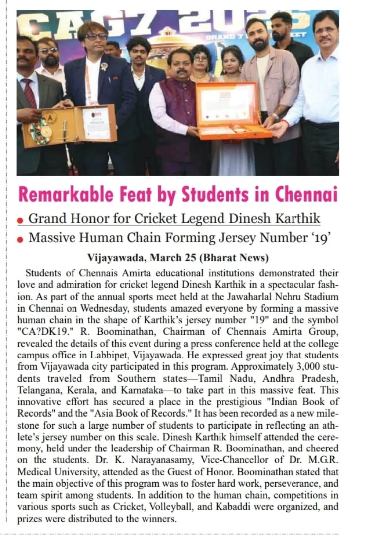 Over 3,000 students from Chennais Amirta institutions united to create a massive human formation reading “CA♡DK19,” honoring Dinesh Karthik’s iconic jersey number.