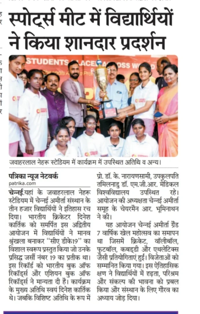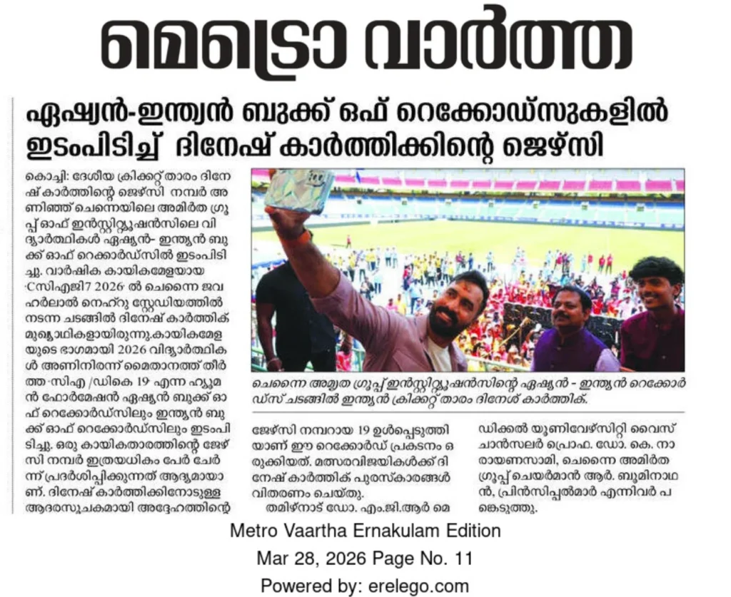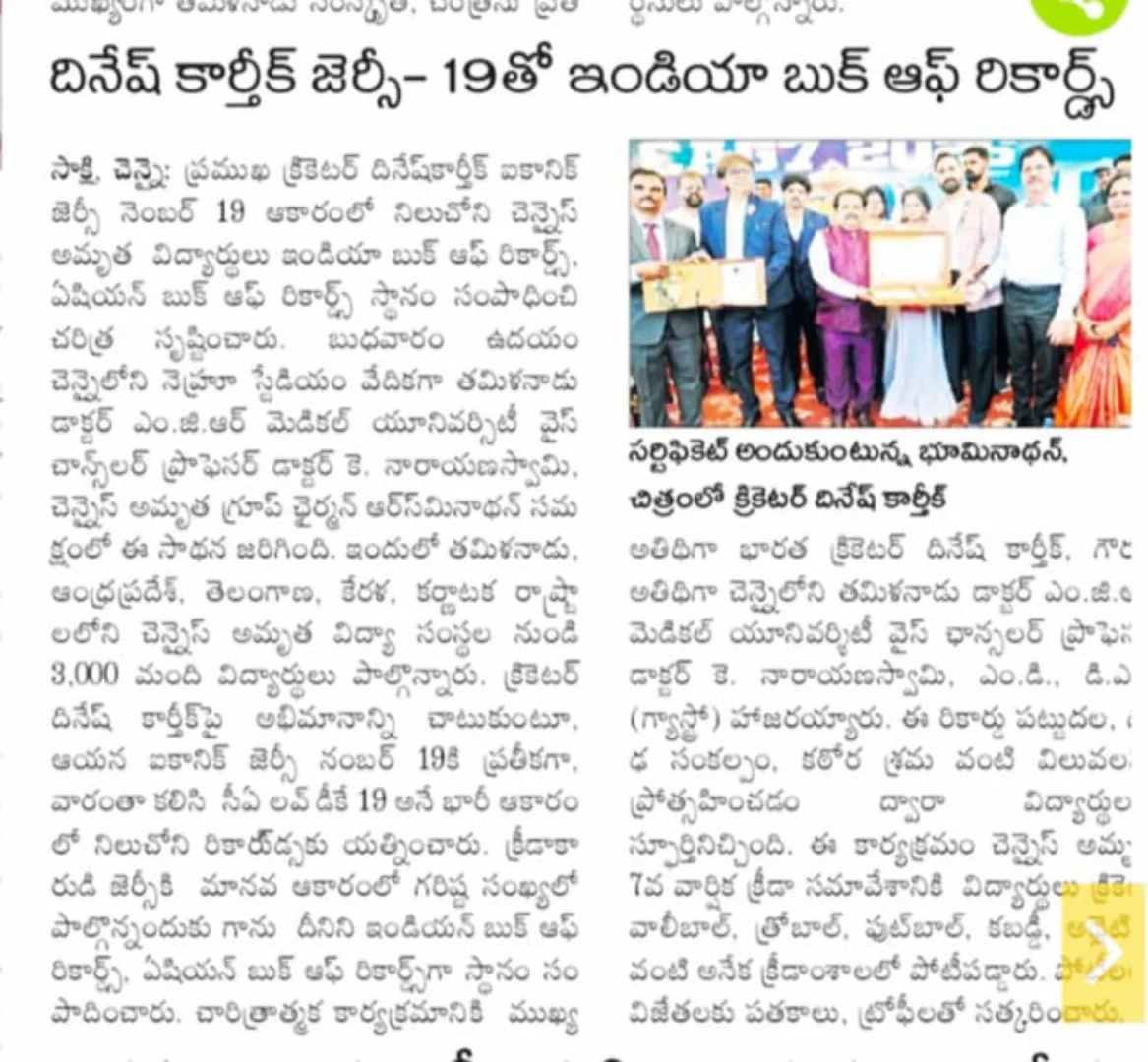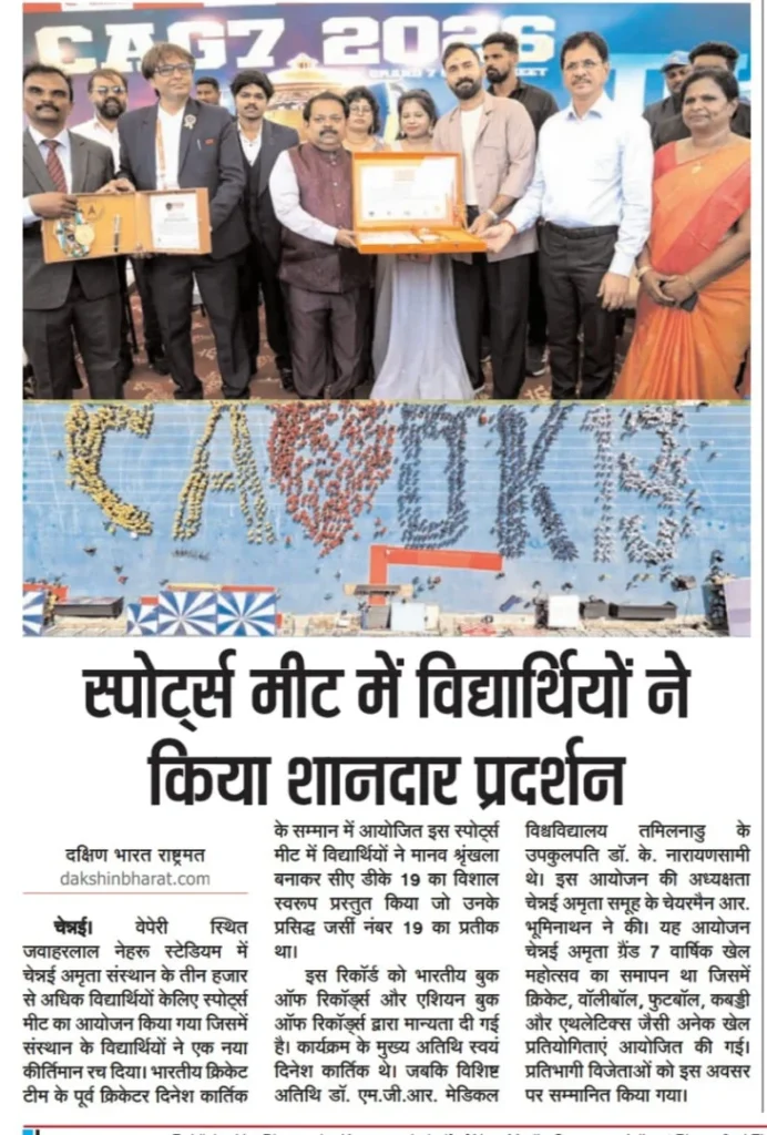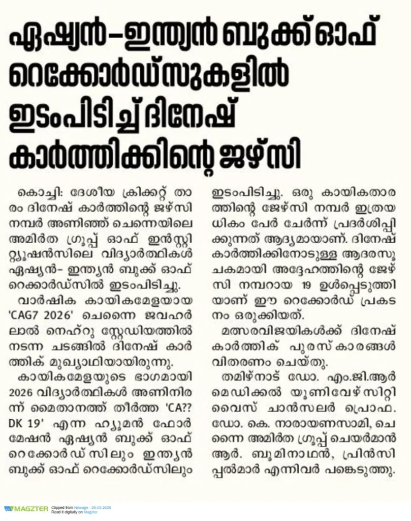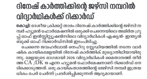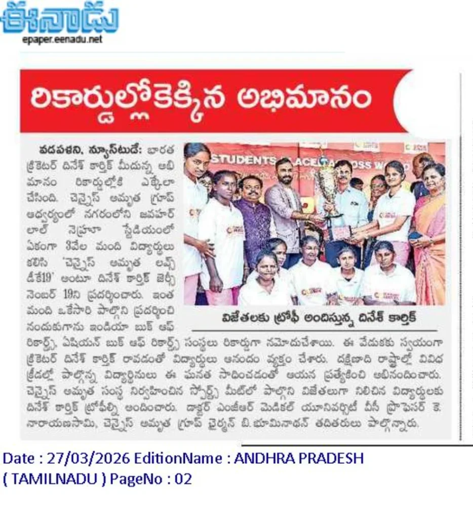 Over 3,000 students from Chennais Amirta institutions united to create a massive human formation reading “CA♡DK19,” honoring Dinesh Karthik’s iconic jersey number.