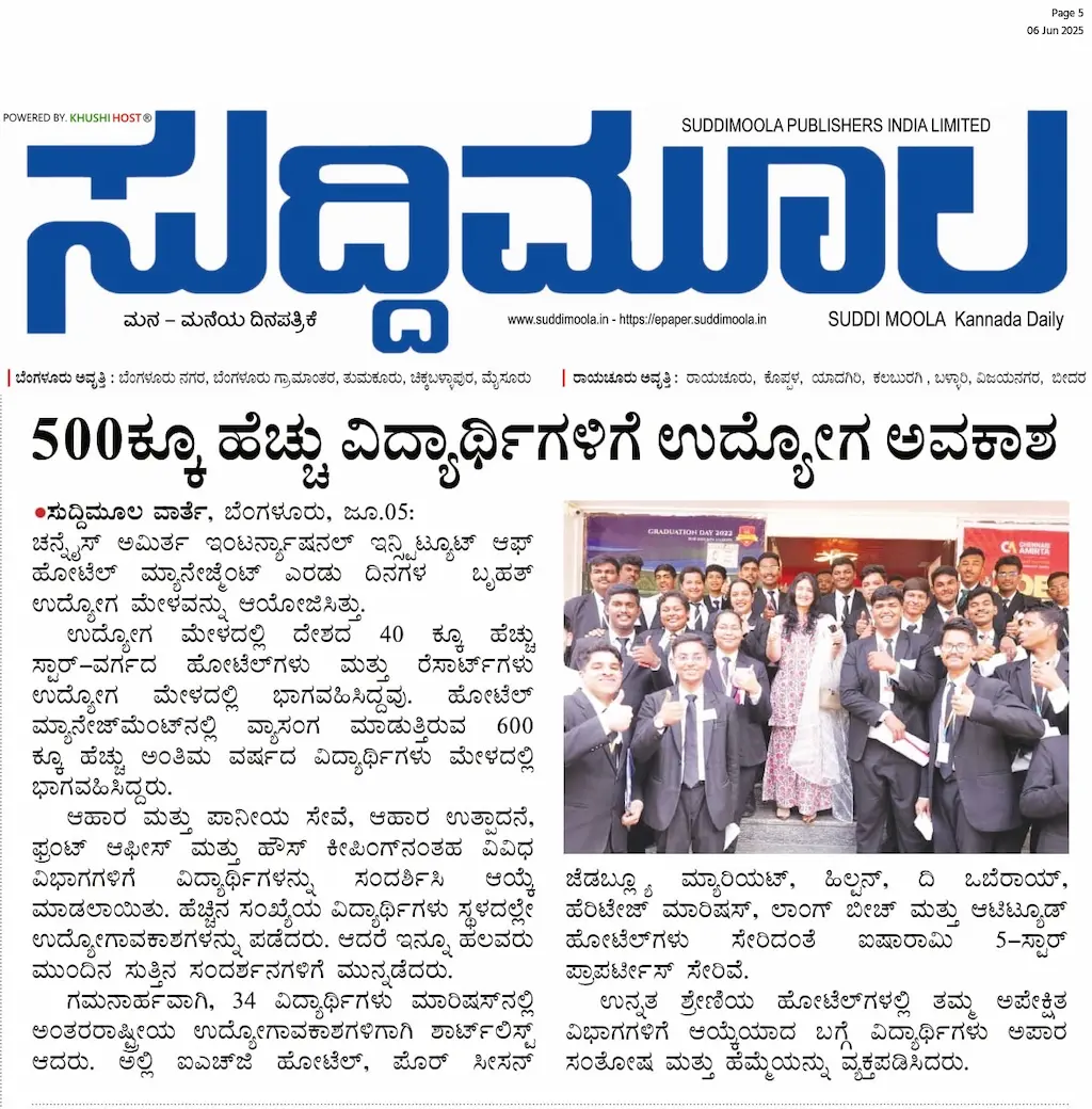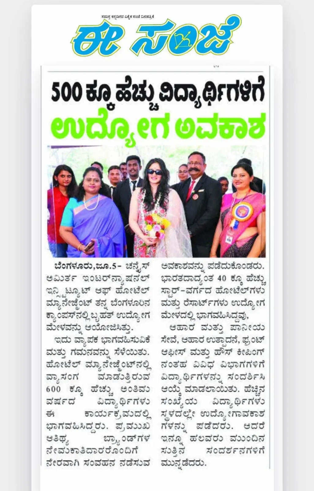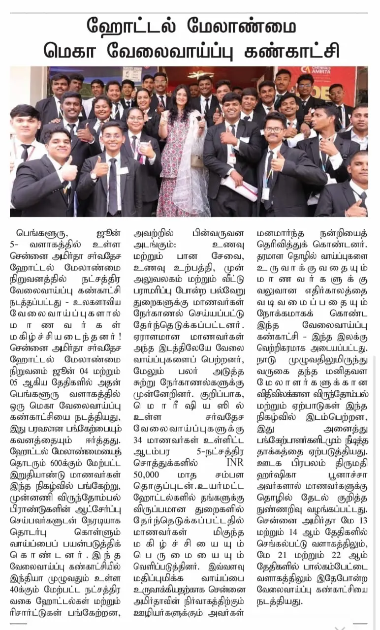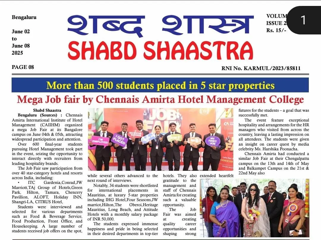 Over 500 students were placed in 5-star properties during the Mega Job Fair organized by Chennais Amirta Hotel Management College, Bengaluru.