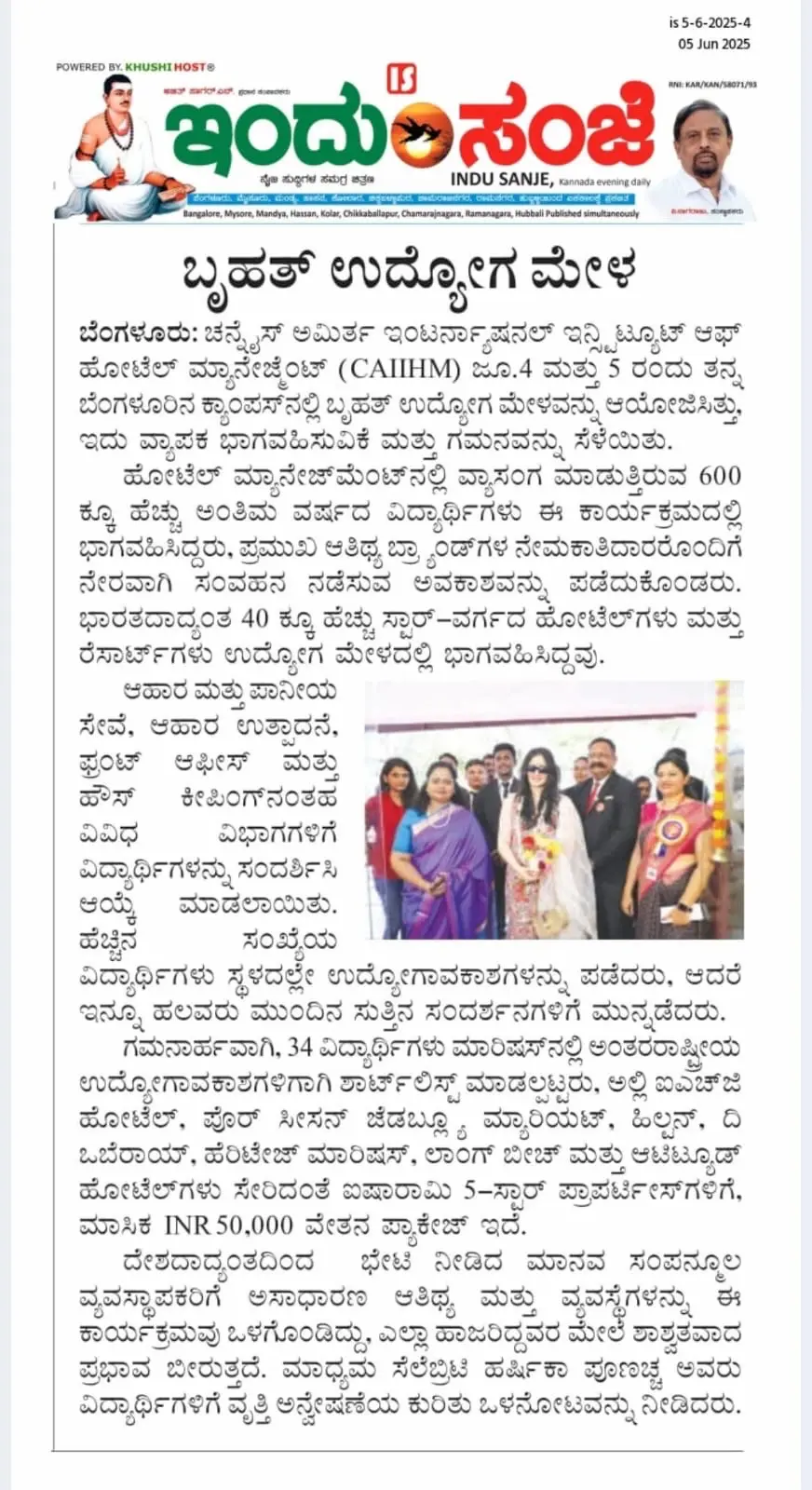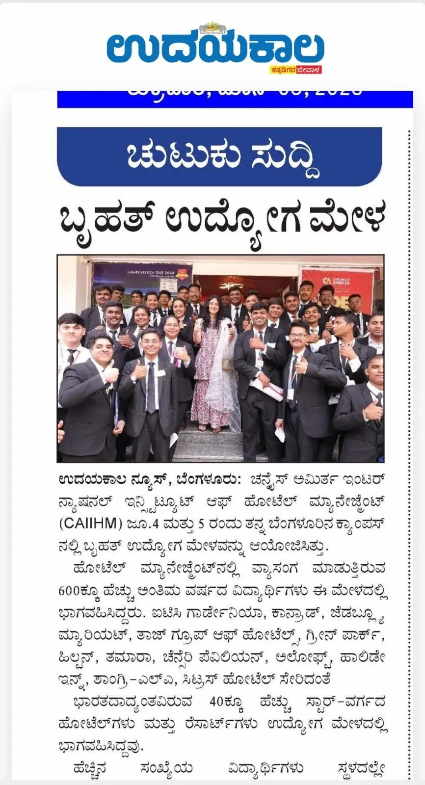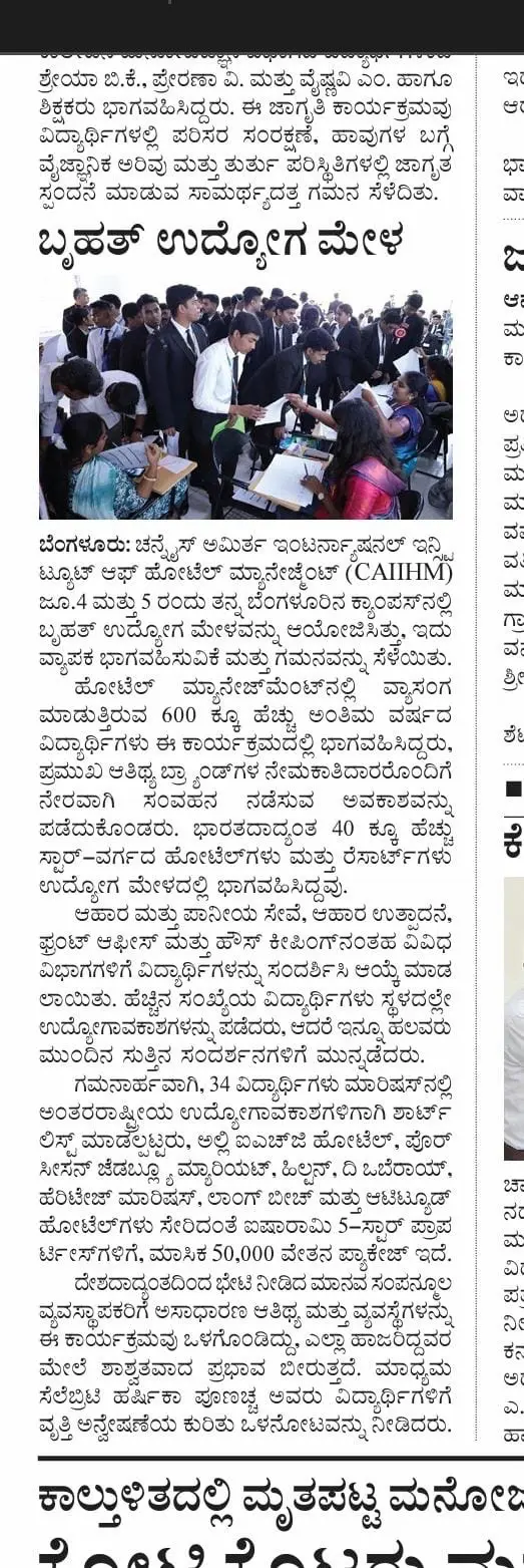 Over 500 students were placed in 5-star properties during the Mega Job Fair organized by Chennais Amirta Hotel Management College, Bengaluru.