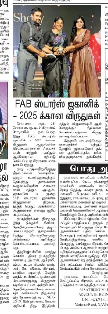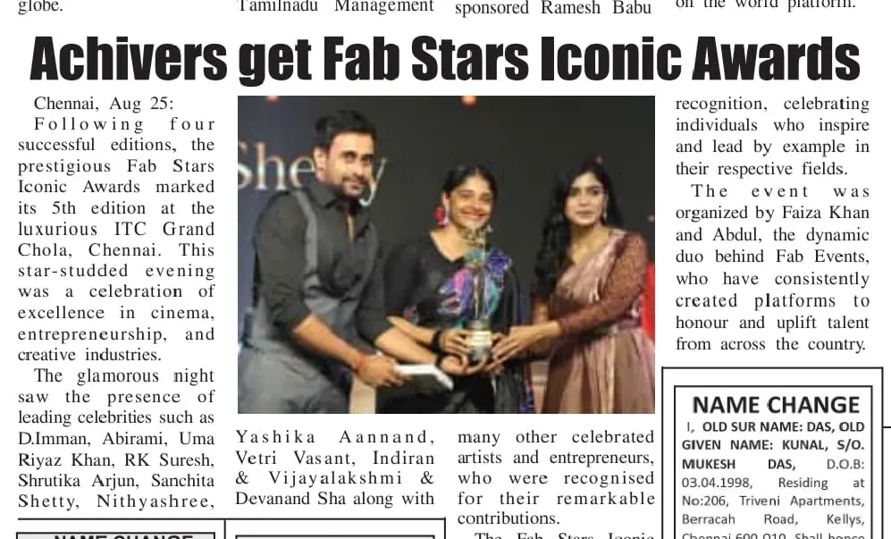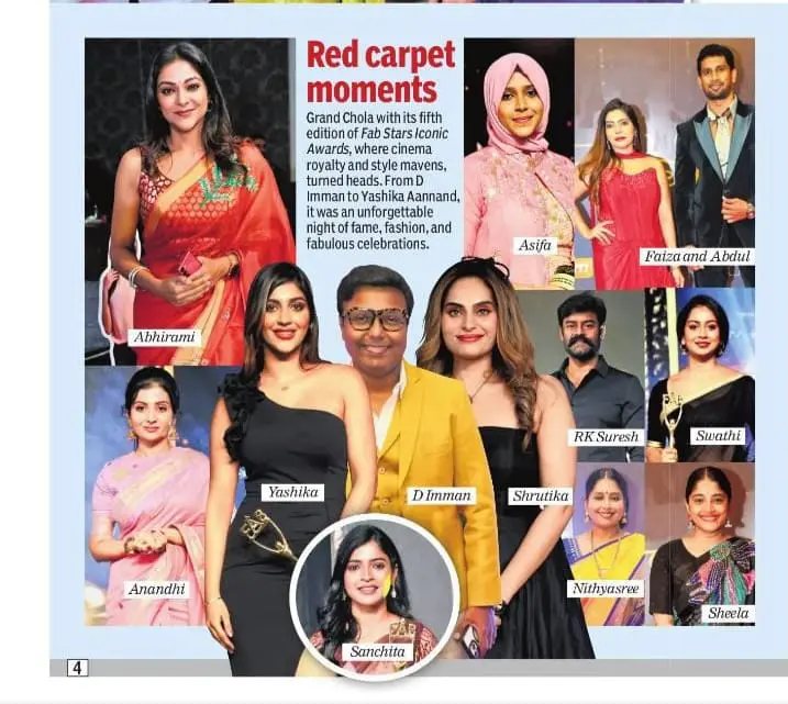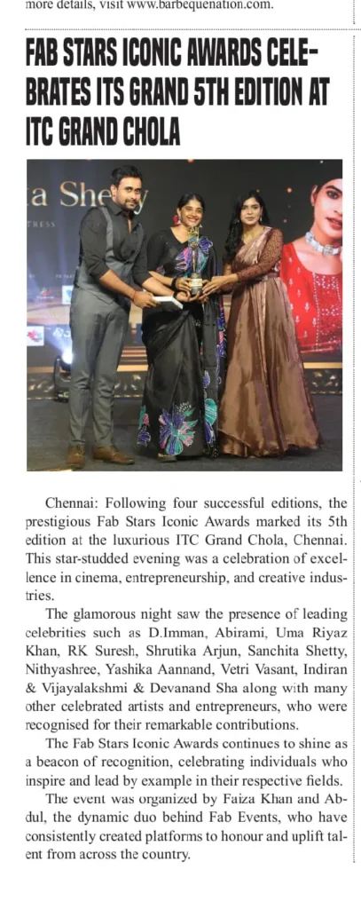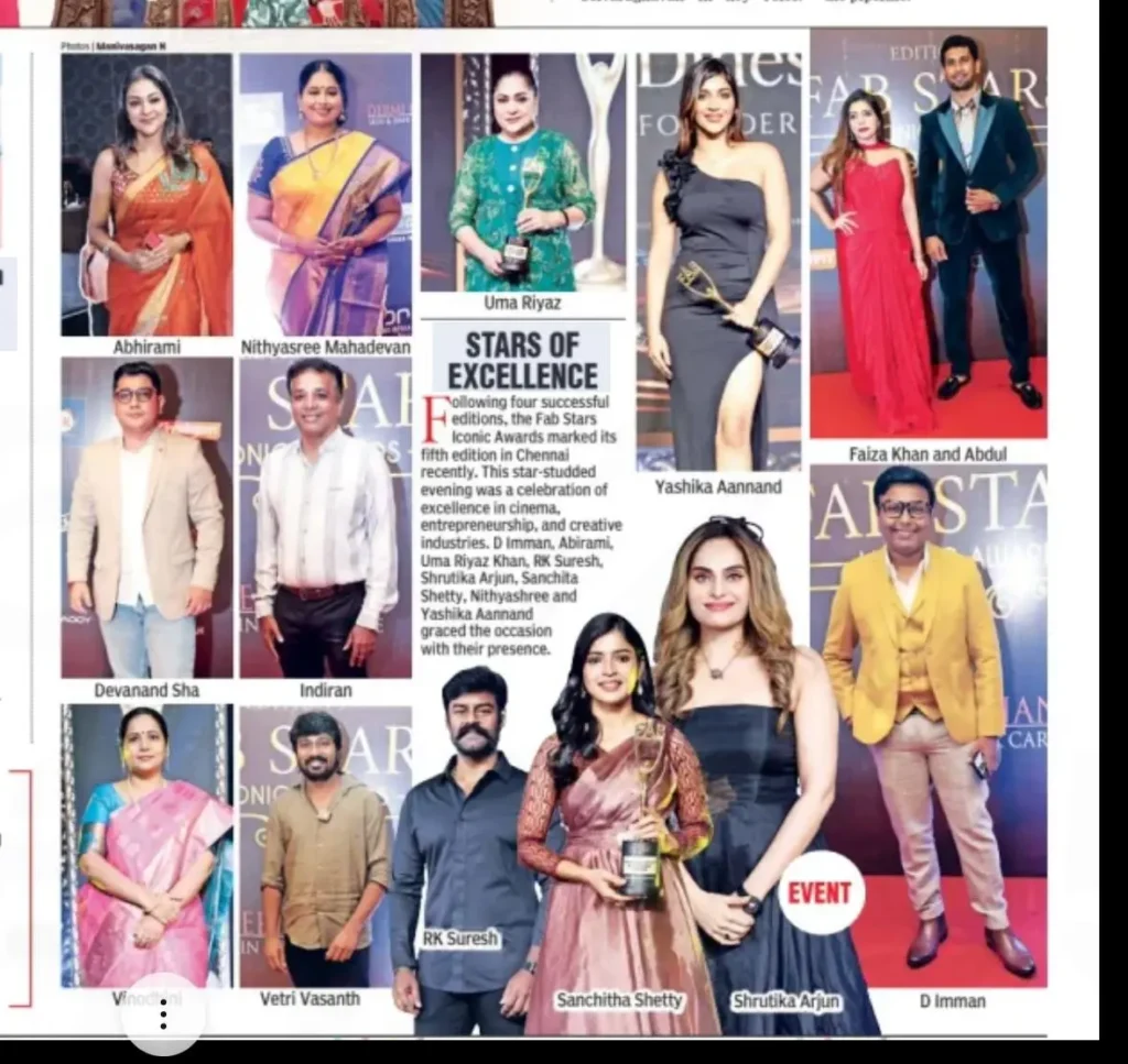 The star-studded evening was graced by leading personalities including D. Imman, Abirami, Uma Riyaz Khan, RK Suresh, Shrutika Arjun, Sanchita Shetty, Nithyashree, Yashika Aannand, Vetri Vasant, Indiran & Vijayalakshmi, Devanand Sha, along with many other distinguished artists and entrepreneurs. The event was curated by Faiza Khan and Abdul of Fab Events, continuing their legacy of creating platforms to recognize and uplift talent across India.