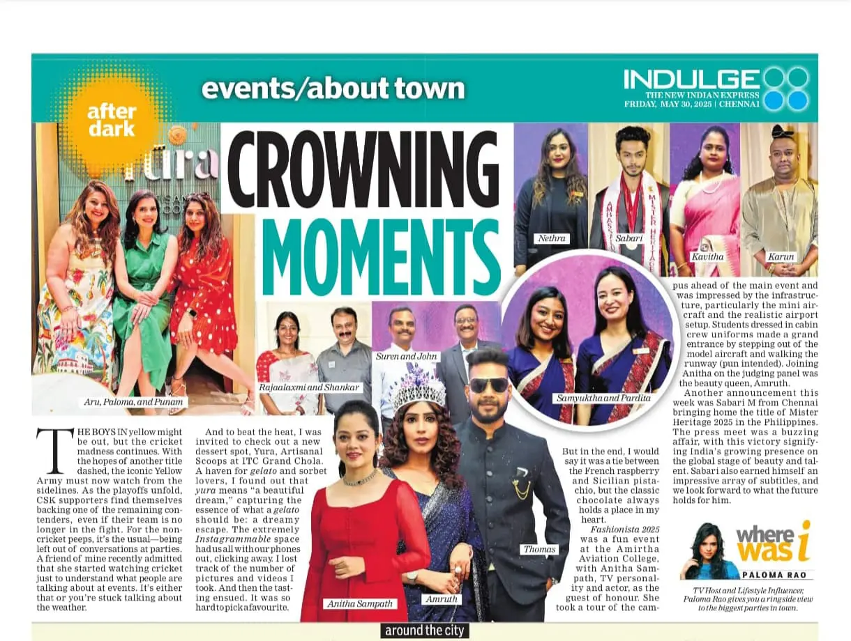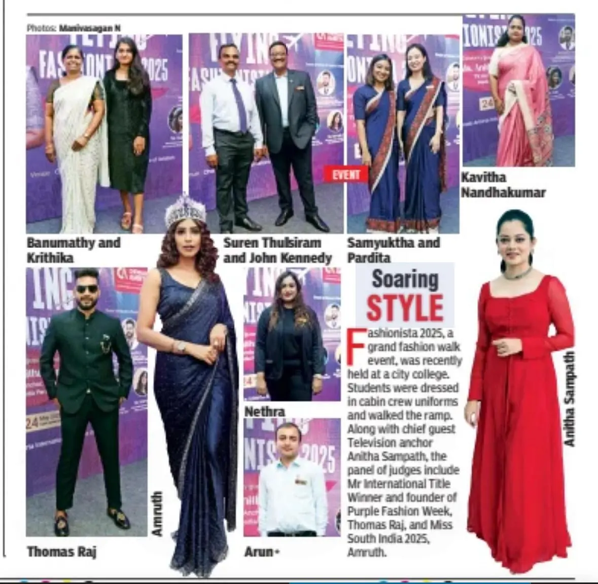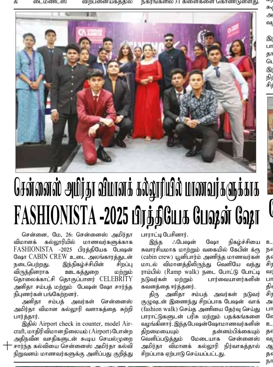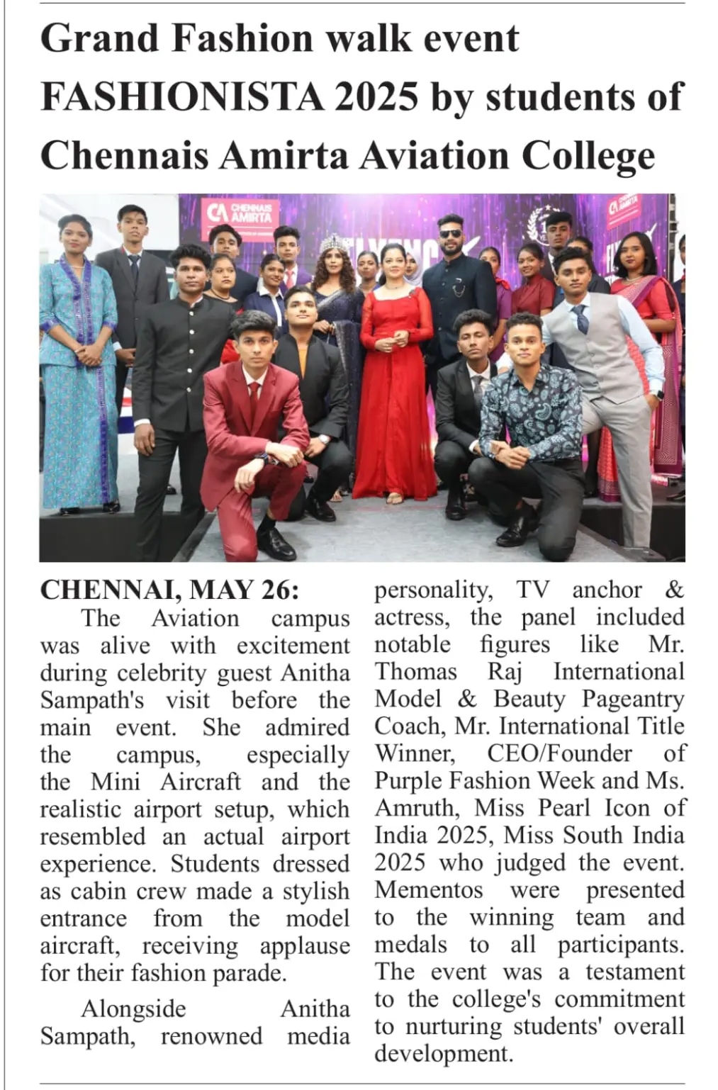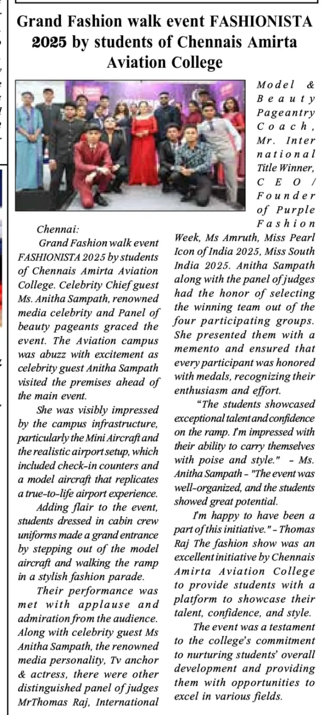 The Grand Fashion Walk Event – FASHIONISTA 2025, organized by the students of Chennais Amirta Aviation College, received widespread media coverage and appreciation. The event was graced by renowned media celebrity and chief guest Ms. Anitha Sampath, along with a distinguished panel of judges from the fashion and pageantry industry. The media coverage for the event was managed by Nexus PR.