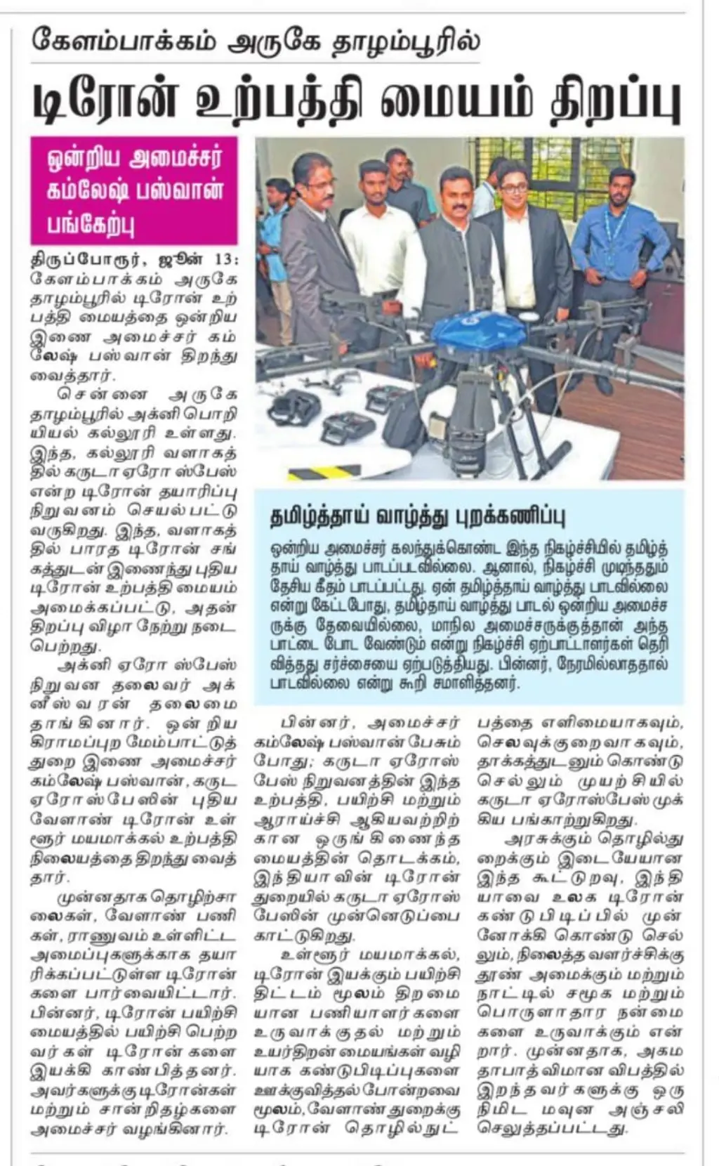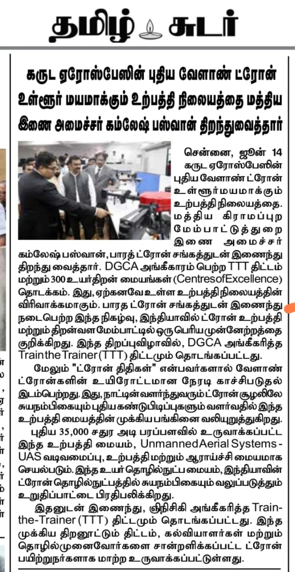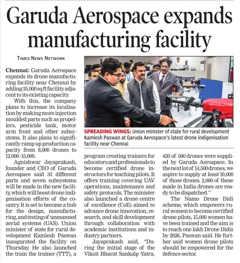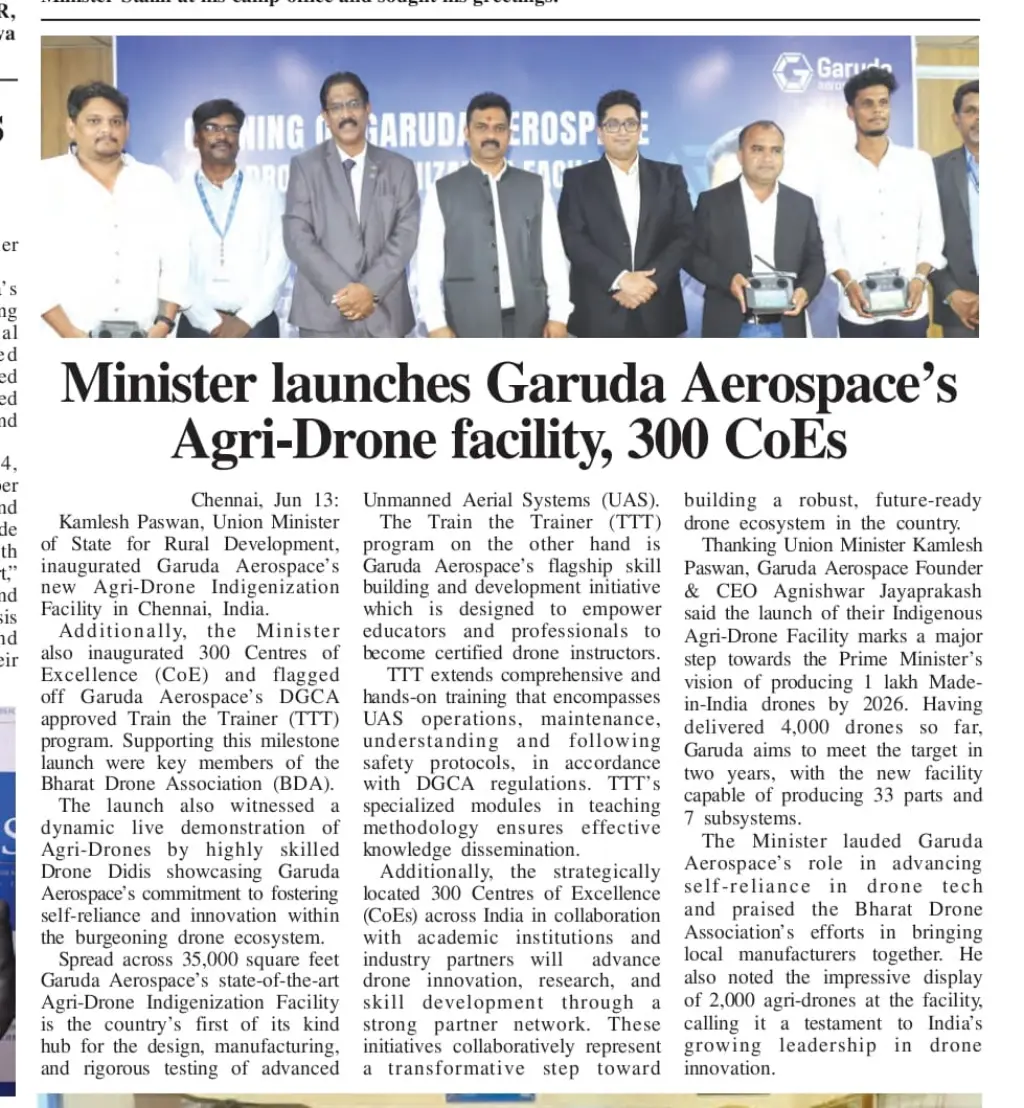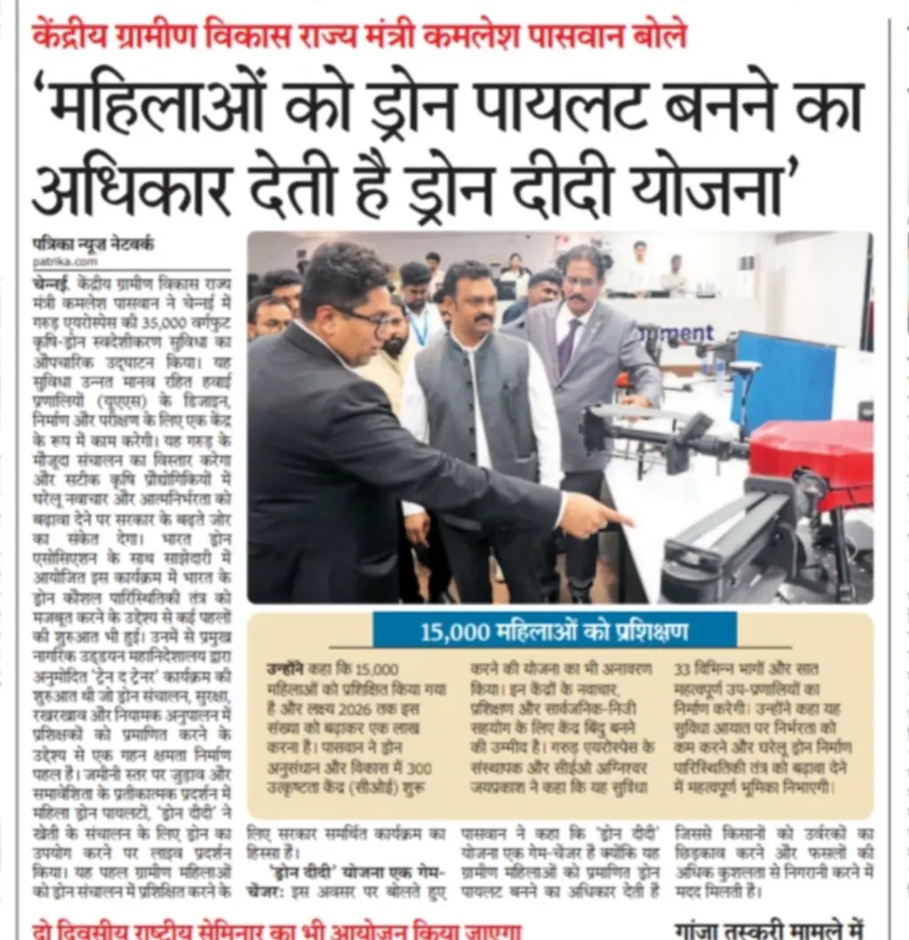 We extend our heartfelt gratitude to the press, digital media platforms, and TV channels for the widespread coverage of Garuda Aerospace’s landmark event, graced by Hon’ble Union Minister Shri Kamlesh Paswan.