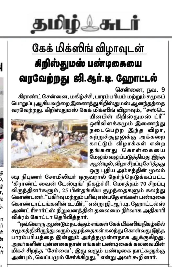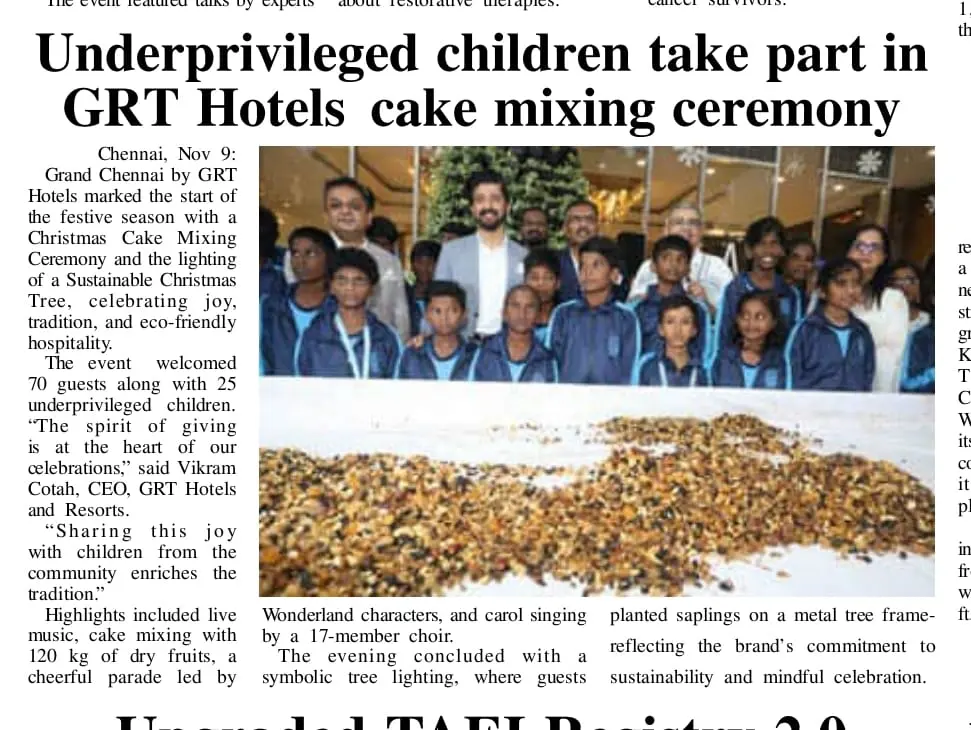 Grand Chennai by GRT Hotels ushered in the festive season with a vibrant celebration that seamlessly blended tradition, sophistication, and community care. The signature Christmas Cake Mixing Ceremony, accompanied by the lighting of a Sustainable Christmas Tree, set the tone for an eco-conscious and heartfelt evening. This year’s festivities were elevated with an exclusive Grand Wine Tasting session curated by Sommelier Praveen Krishnamurthy, welcoming 70 distinguished guests and 25 children from the community to share in the joy. From a lively musical welcome to the magical parade and carol performances, the event reflected Grand Chennai’s commitment to meaningful and mindful celebrations.