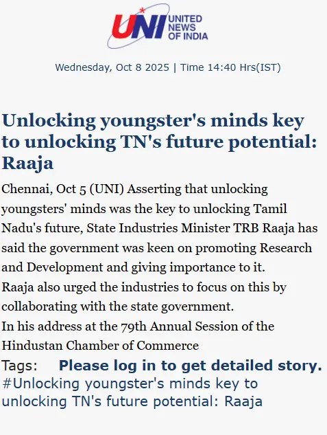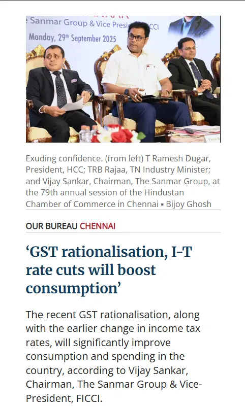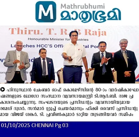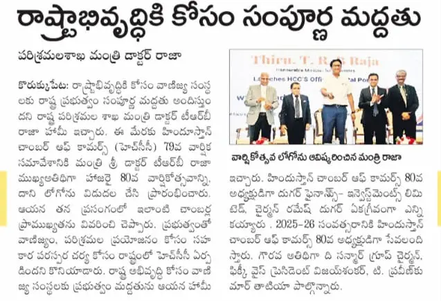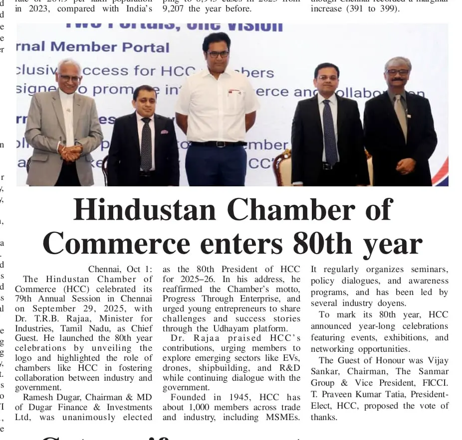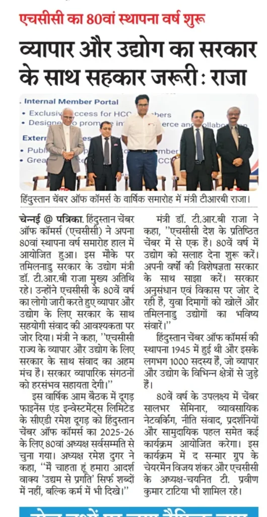The 79th Annual Session of the Hindustan Chamber of Commerce (HCC) witnessed the election of Mr. Ramesh Dugar, Chairman & MD of Dugar Finance & Investments Ltd, as the 80th President for 2025-26. The event, presided over by Sri Dr. T.R.B Rajaa, Honourable Minister for Industries, Government of Tamil Nadu, also marked the launch of HCC’s 80th-year celebrations with the unveiling of its commemorative logo. In his address, Dr. Rajaa emphasized the importance of chambers like HCC for collaborative interaction between trade, industry, and the government and encouraged members to explore sectors such as EVs, drones, and shipbuilding. HCC President Ramesh Dugar highlighted the chamber’s motto, “Progress Through Enterprise,” and initiatives like the Udhayam platform for entrepreneurs.