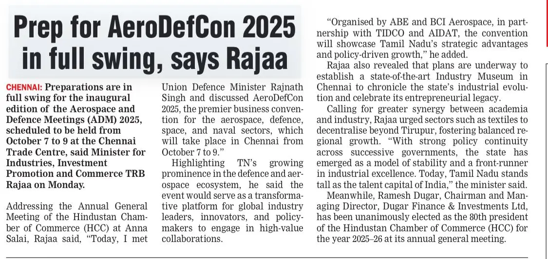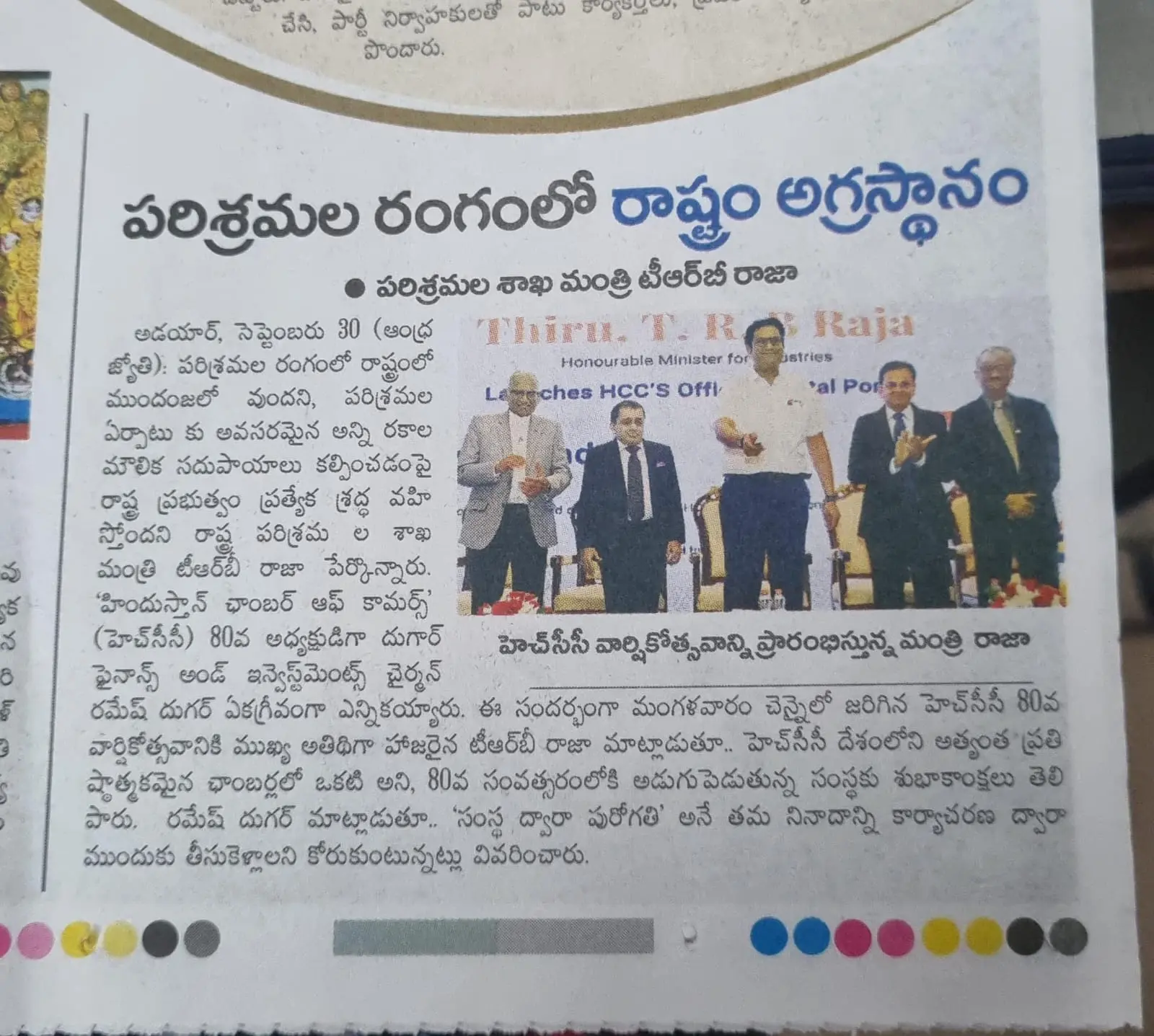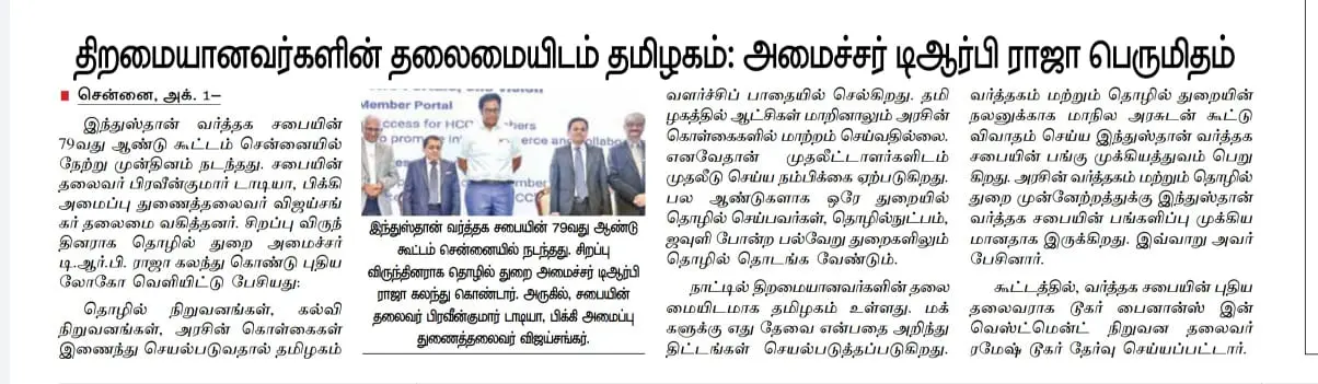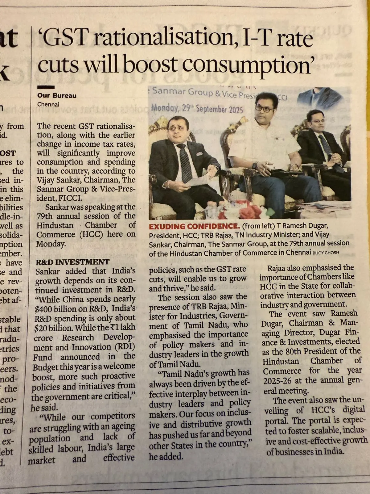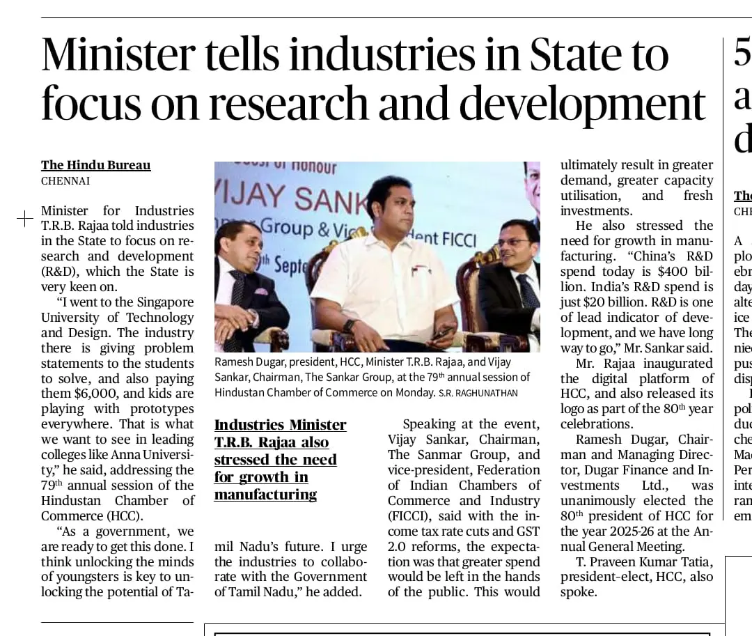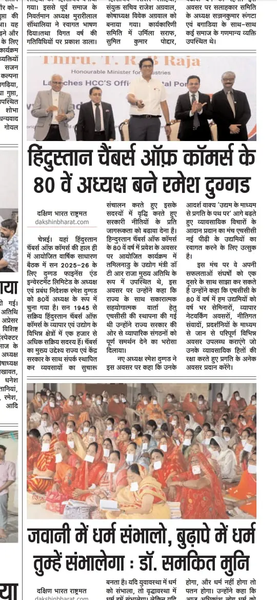 The 79th Annual Session of the Hindustan Chamber of Commerce (HCC) witnessed the election of Mr. Ramesh Dugar, Chairman & MD of Dugar Finance & Investments Ltd, as the 80th President for 2025-26. The event, presided over by Sri Dr. T.R.B Rajaa, Honourable Minister for Industries, Government of Tamil Nadu, also marked the launch of HCC’s 80th-year celebrations with the unveiling of its commemorative logo. In his address, Dr. Rajaa emphasized the importance of chambers like HCC for collaborative interaction between trade, industry, and the government and encouraged members to explore sectors such as EVs, drones, and shipbuilding. HCC President Ramesh Dugar highlighted the chamber’s motto, “Progress Through Enterprise,” and initiatives like the Udhayam platform for entrepreneurs.
