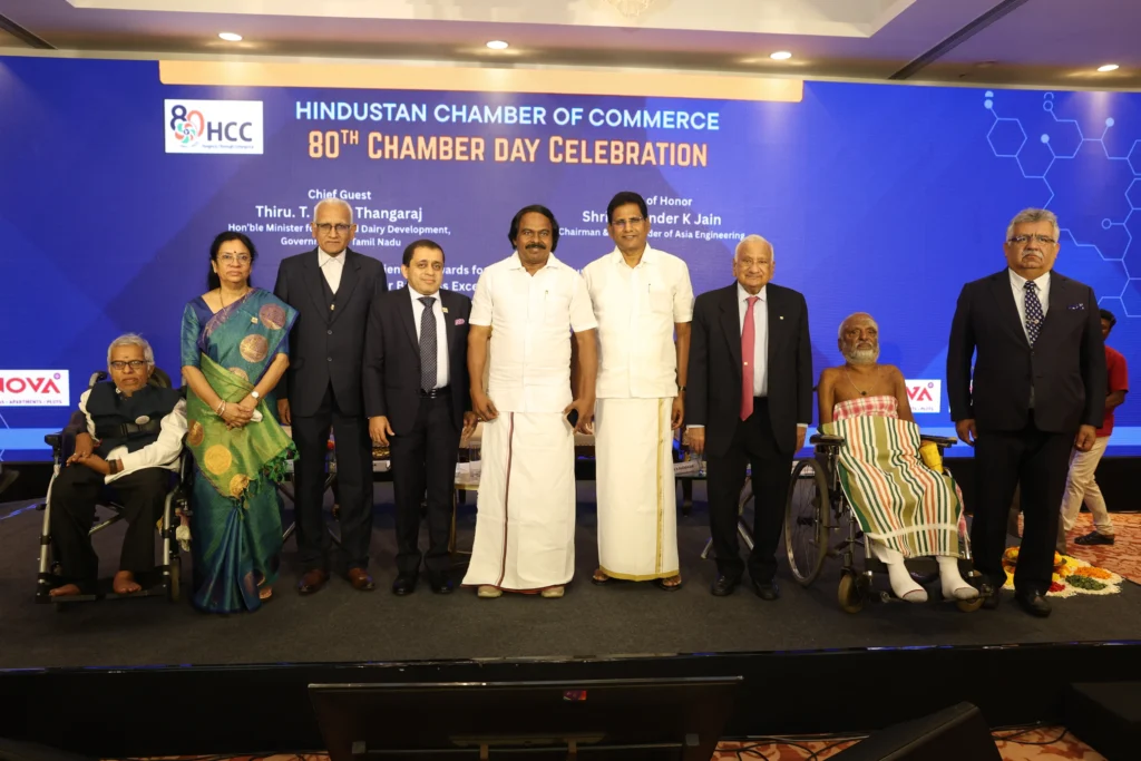 Hindustan Chamber of Commerce 80th Chamber Day Celebrations, HCC President Mr.T. Ramesh Dugar , Hon.Minister Thiru T. Mano Thangaraj  & Mr.Mahinder K Jain honoured CHAMPION OF HUMANITY AWARDs to Business Excellence and Remarkable contribution to Society