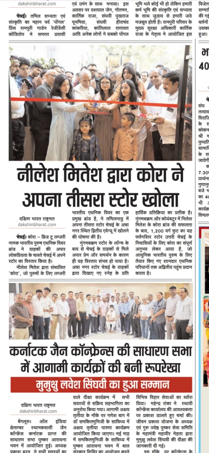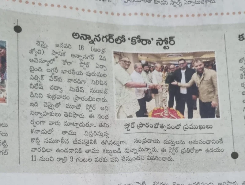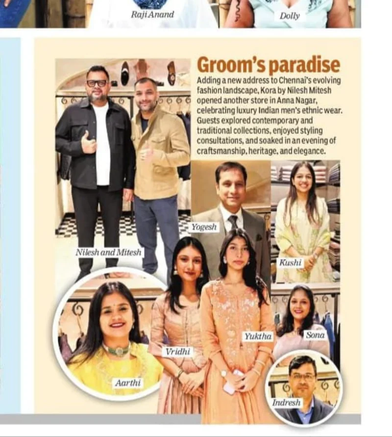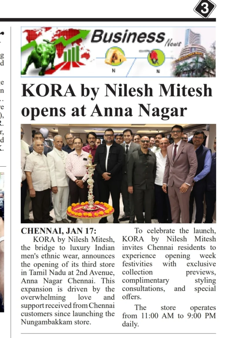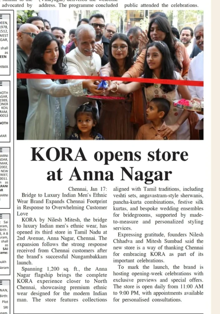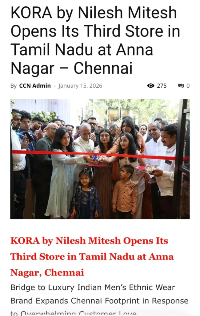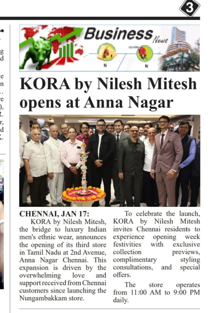 KORA by Nilesh Mitesh Opens New Luxury Men’s Ethnic Wear Store in Anna Nagar, Chennai- Media Coverage