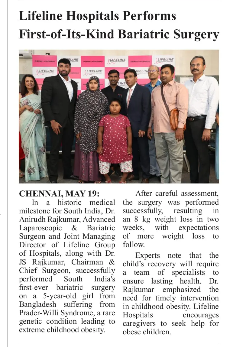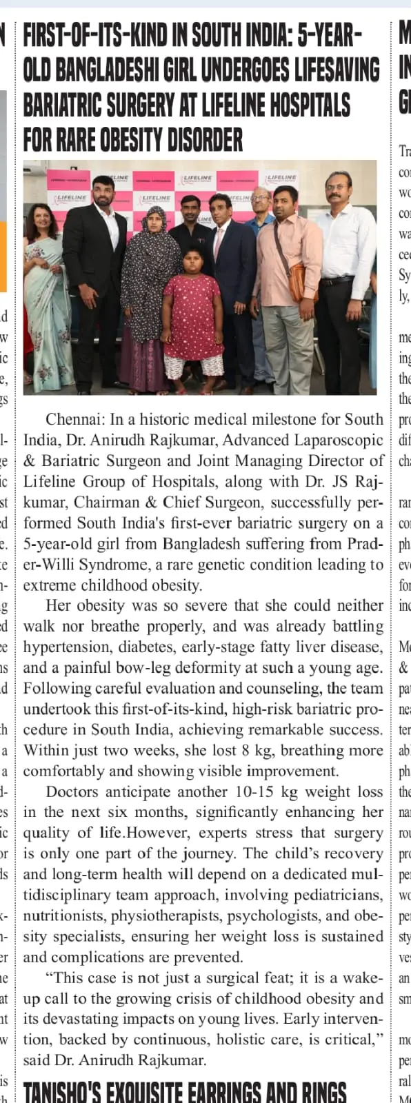 Lifeline Hospitals marked a major medical milestone by successfully performing South India’s first bariatric surgery on a 5-year-old girl from Bangladesh suffering from a rare obesity disorder. This pioneering procedure not only showcased the hospital’s expertise in handling complex cases but also highlighted the importance of cross-border access to advanced healthcare.