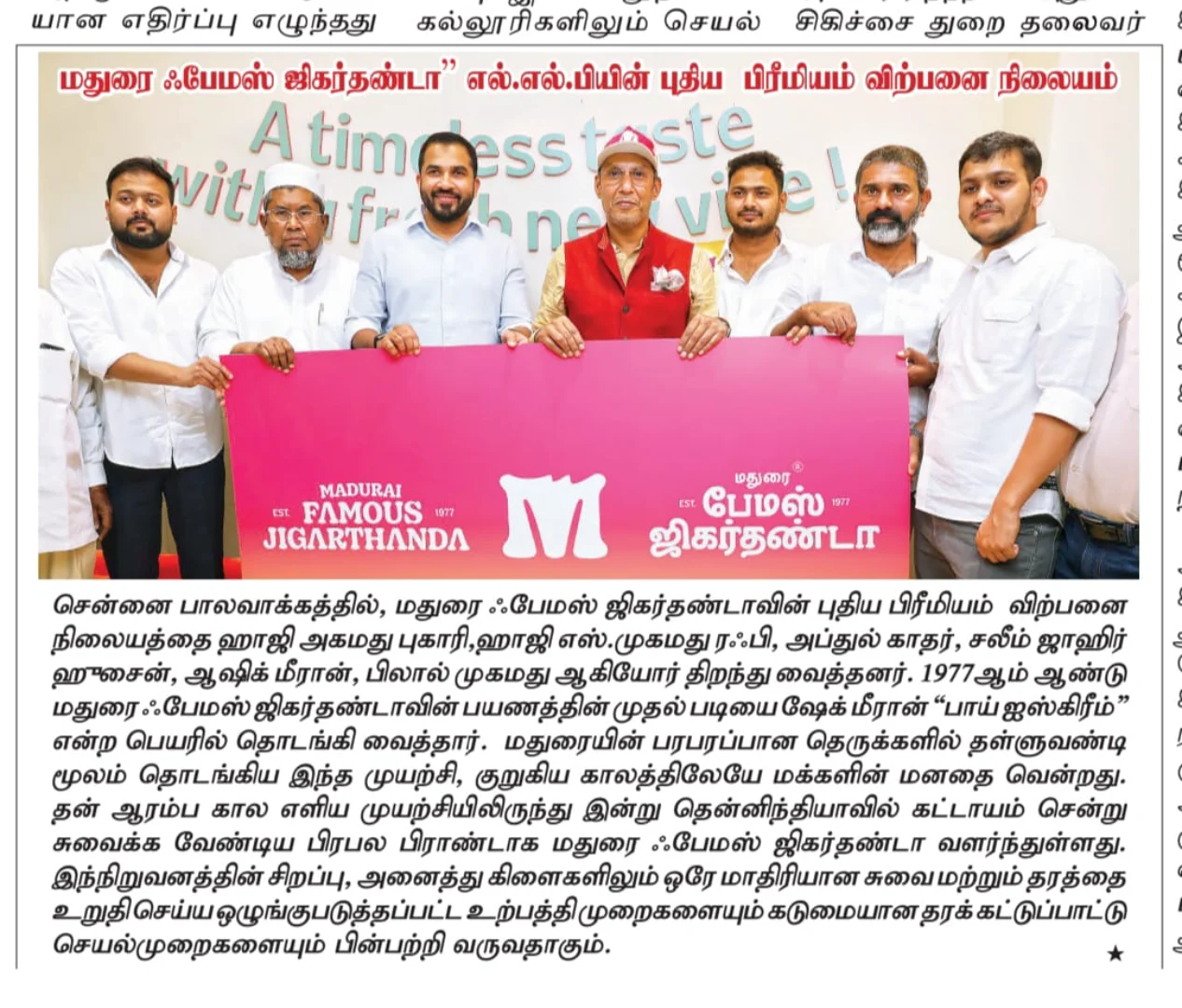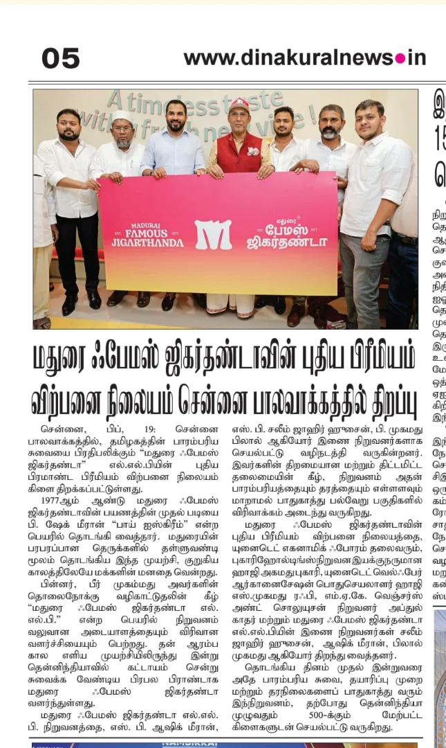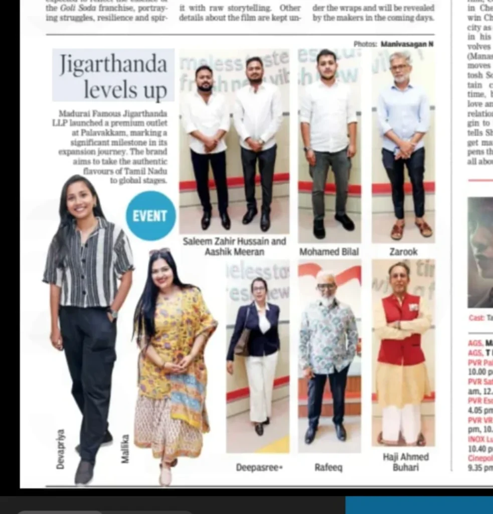 Madurai Famous Jigarthanda LLP proudly announces the launch of its Premium Version Jigarthanda outlet at Palavakkam, Chennai, marking a key milestone in its expansion journey. Led by Co-Founders Mr. S. B. Aashik Meeran, Mr. S. B. Saleem Zahir Hussain, and Mr. B. Mohamed Bilal, the brand continues to preserve its nearly five-decade legacy of authenticity. The grand inauguration was graced by Haji Ahmed Buhari, Haji S. Mohamed Rafi, and Mr. Abdul Khader M. Founded in 1977 by Mr. P. Sheik Meeran as a humble pushcart serving “Bai Ice cream” in Madurai, the brand was later strengthened under Mr. Beer Muhammed and has grown into a household name with 500+ outlets across Southern India. With standardized production, strict quality control, and strong franchise support, the company now aims to expand across India and into international markets while safeguarding its original taste and heritage.