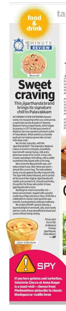 Madurai Famous Jigarthanda LLP Launches Premium Jigarthanda Outlet at Palavakkam, Chennai- Media Coverage