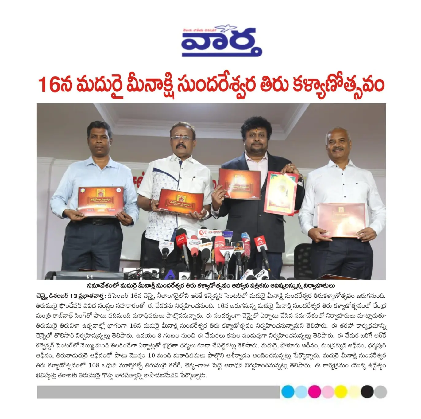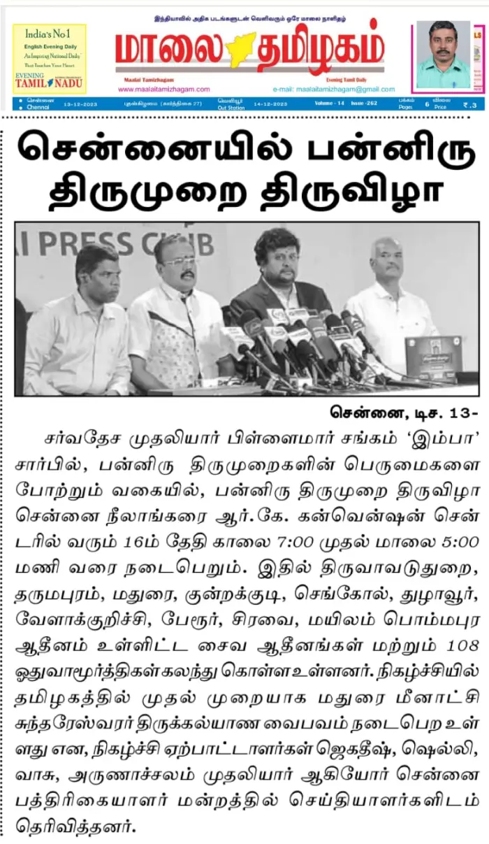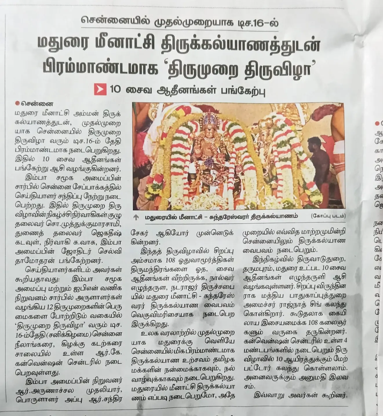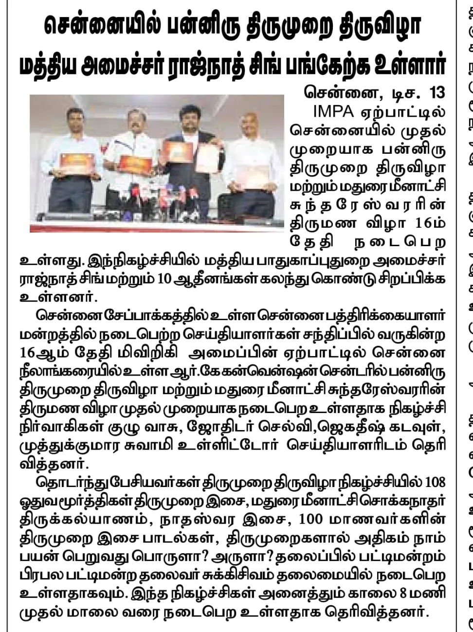 Press Meet Media Coverage Report: IMPA & Mangal Deep’s Divine ‘Thirumurai Thiruvizha’ Festival and ‘Madurai Meenakshi Sundareswarar Thirukalyanam’ in Chennai with Chief Guest Defence Minister Mr. Rajnath Singh & 10 Aatheenams, Organized by GR Events on 16th Dec, 2023.