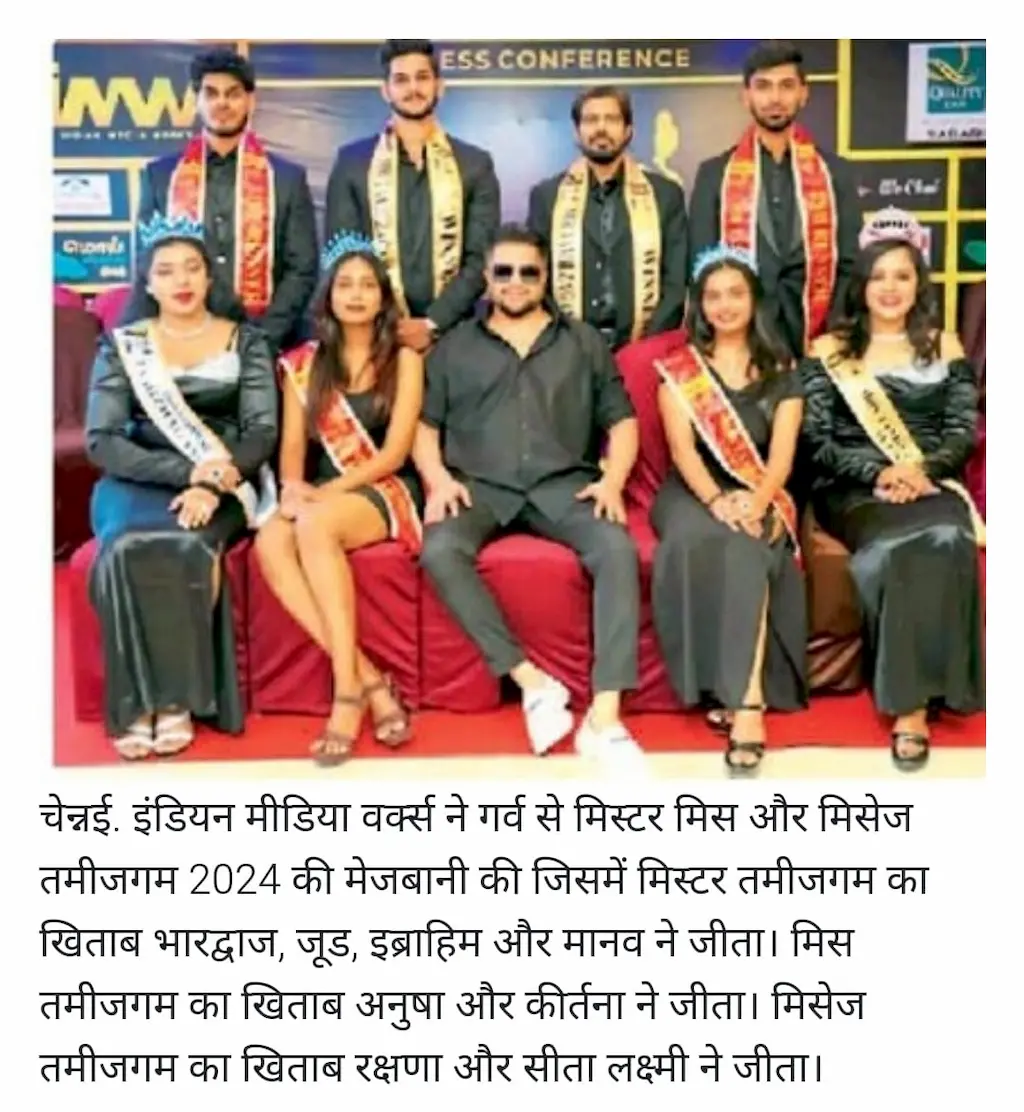 Indian Media Works proudly hosted Mr Miss & Mrs Tamizhagam 2024, where in Mr Tamizhagam titles were won by Bharadwaj, Jude, Ibrahim and Manav; Miss Tamizhagam titles were won by Anusha and Keethana; Mrs Tamizhagam titles were won by Rakshana and Seeta Laxmi.