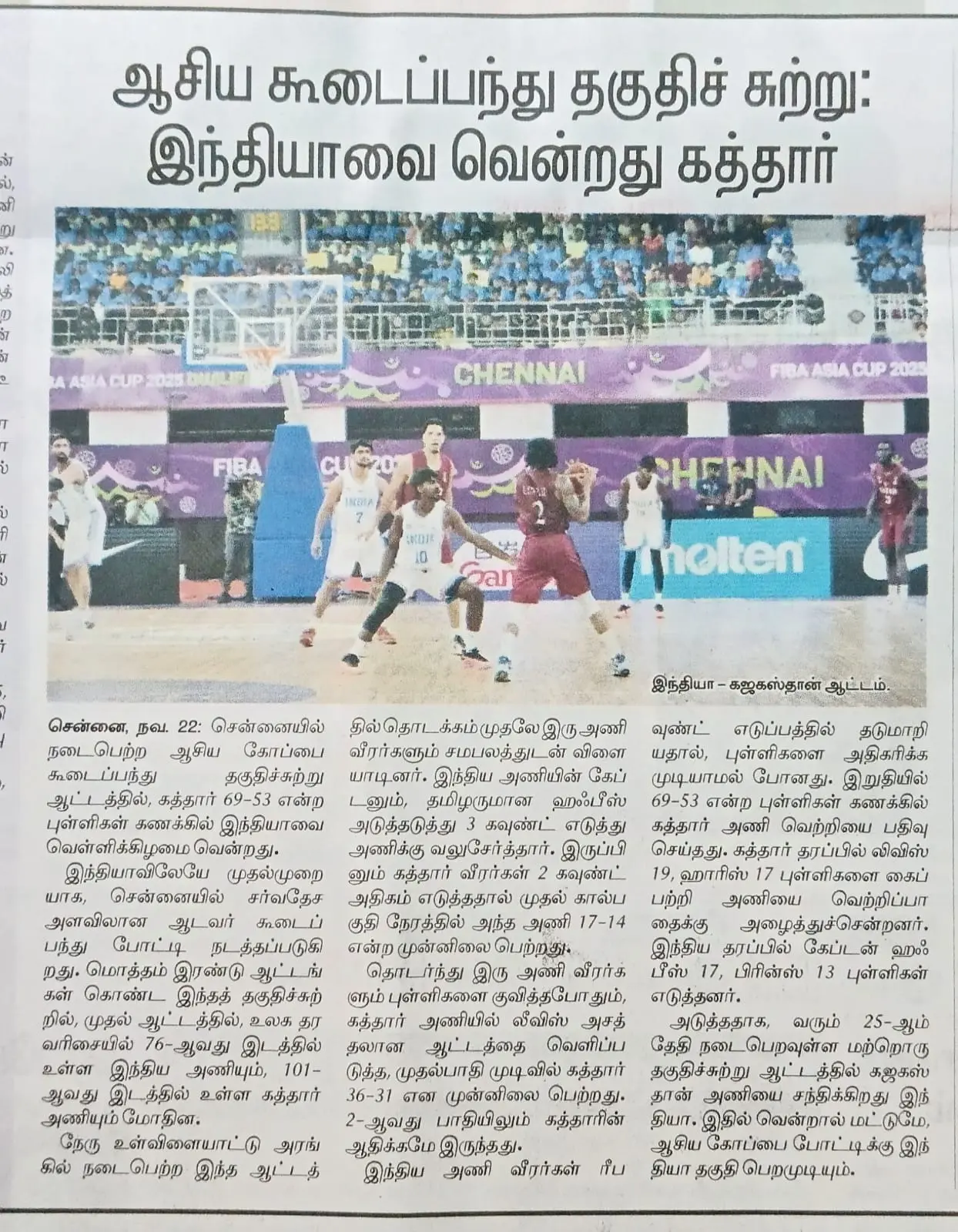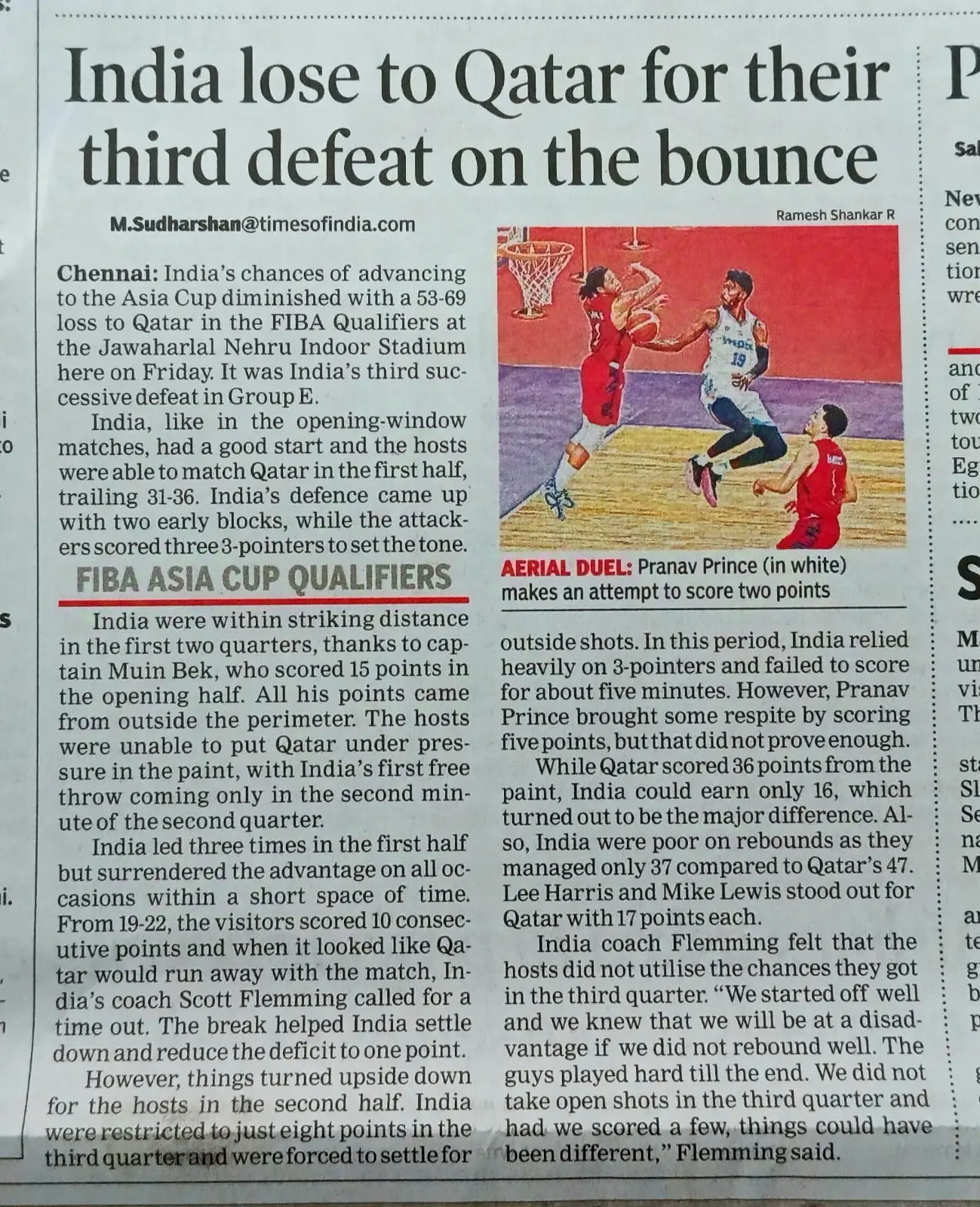 The Indian team lost against Qatar in the international Men’s FIBA Asia Cup Basketball Qualifier held in Chennai. Qatar team has registered a fantastic victory with the score of 69-53 against India.