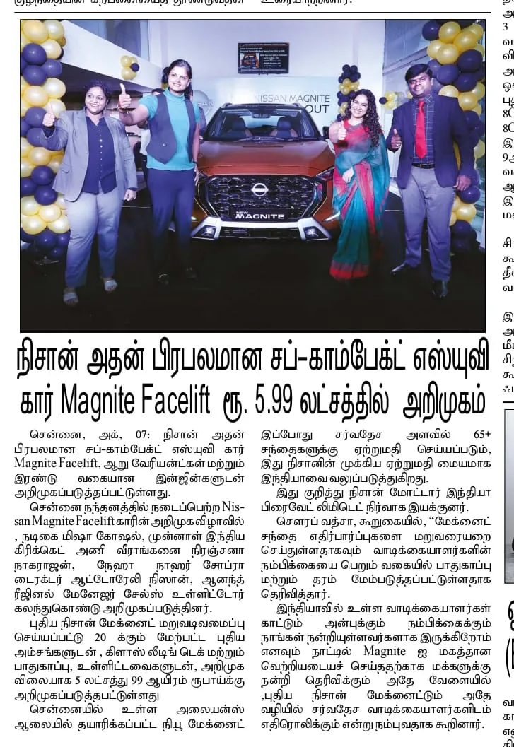 New Nissan Magnite Facelift launched at Special Introductory Price of INR 5.99 LAKHS, unveiled by Actress Mrs. Misha Ghoshal, Former Indian Women Cricketer Mrs. Niranjana Nagarajan, Autorelli Nissan Director Mrs.Neha Nahar Chopra at Nandanam, Chennai.