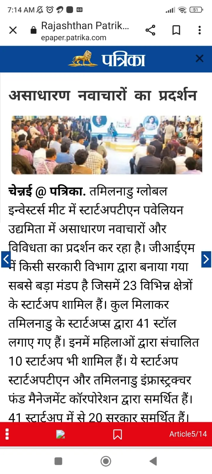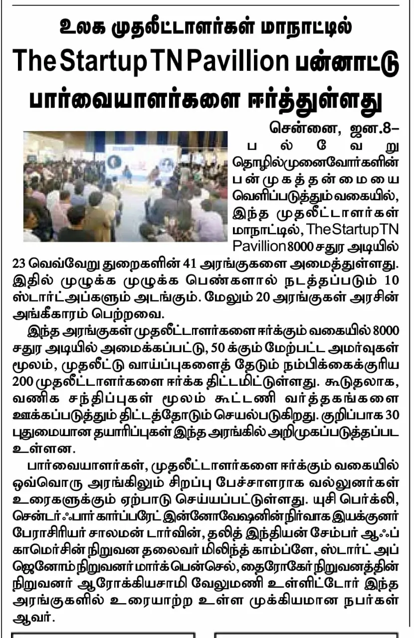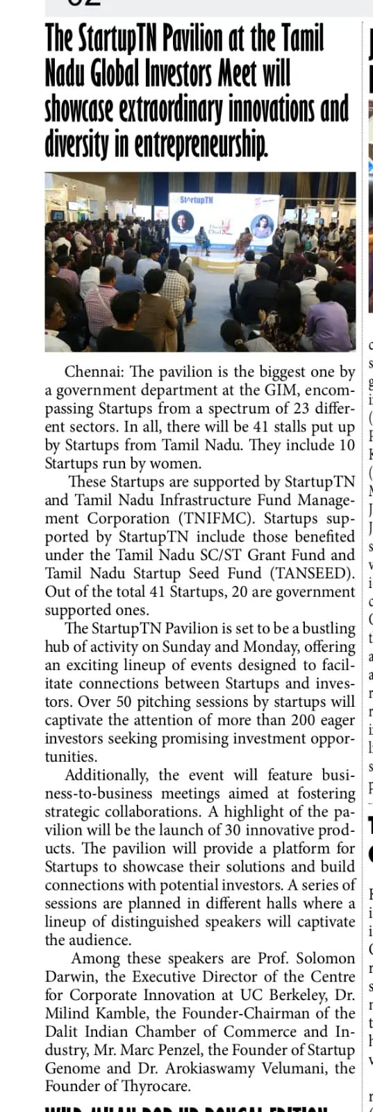 Media Coverage Report – The StartupTN Pavilion at the Tamil Nadu Global Investors Meet TV News Highlights News 7 Tamil News Tamil 24X7 Newspaper Gallery Share this article on
