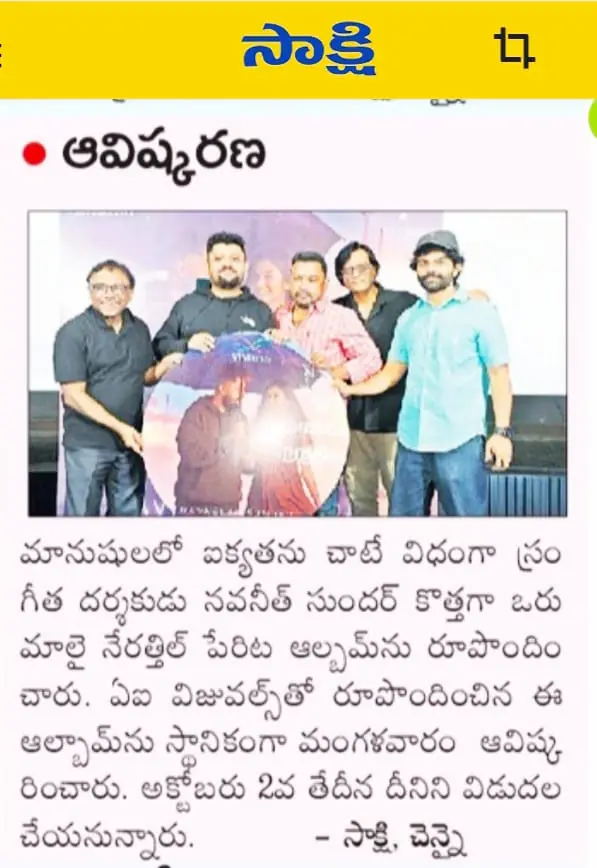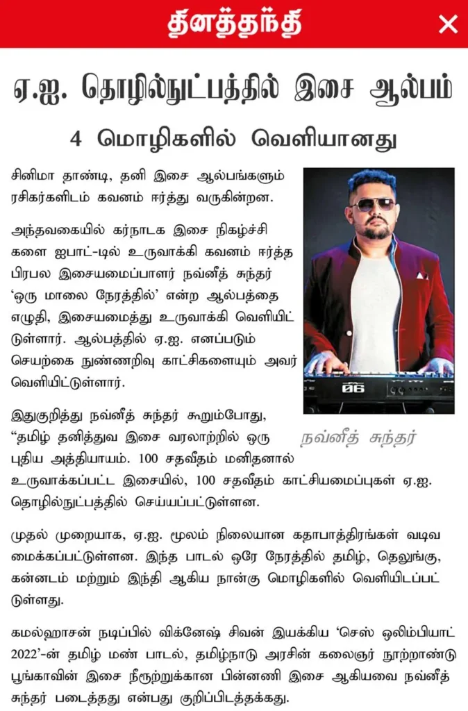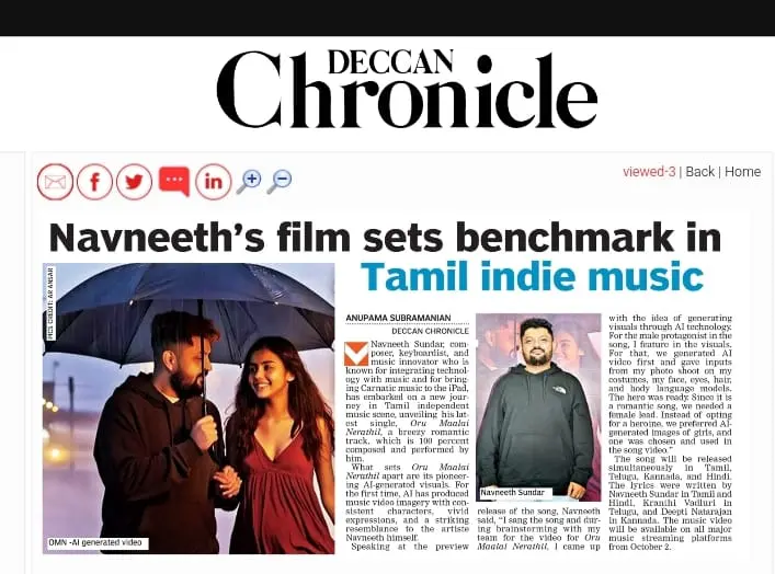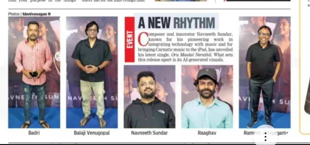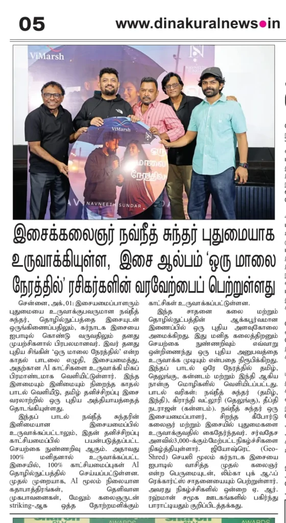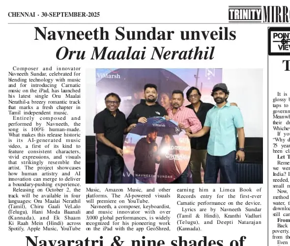 We’re thrilled to share the overwhelming media response to the preview launch of Navneeth Sundar’s Oru Maalai Nerathil — the first multilingual romantic single featuring AI-generated visuals.
