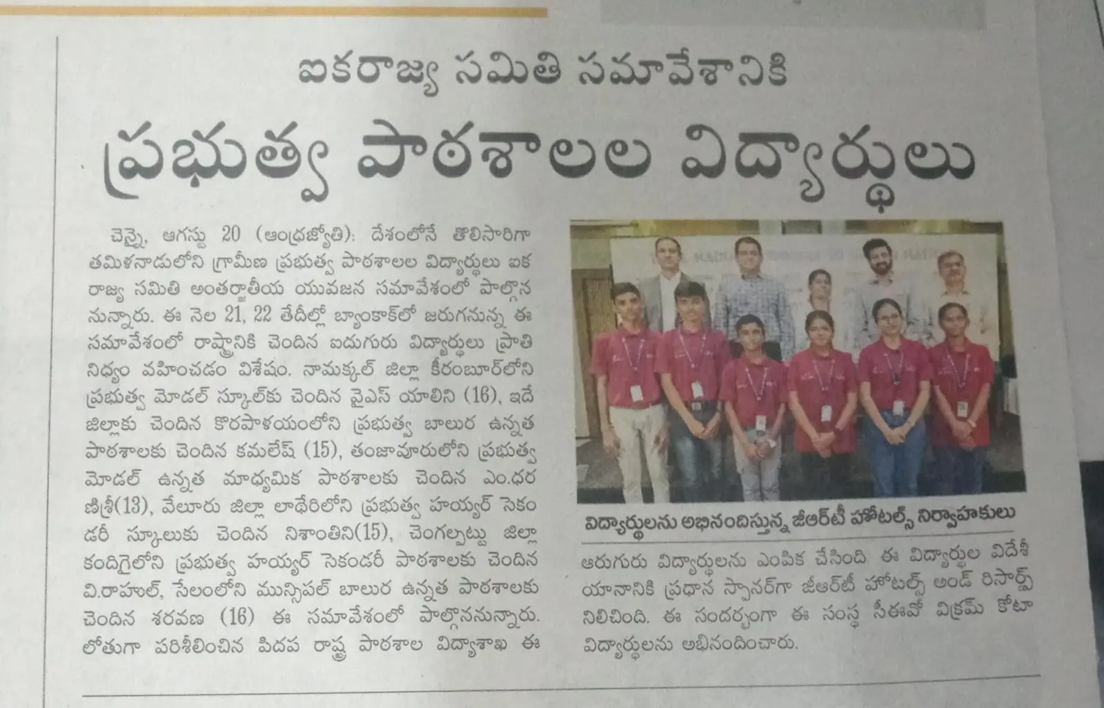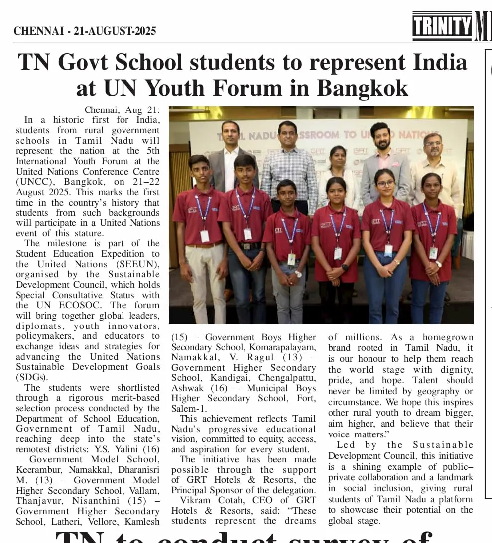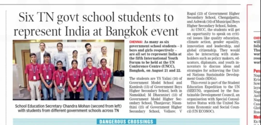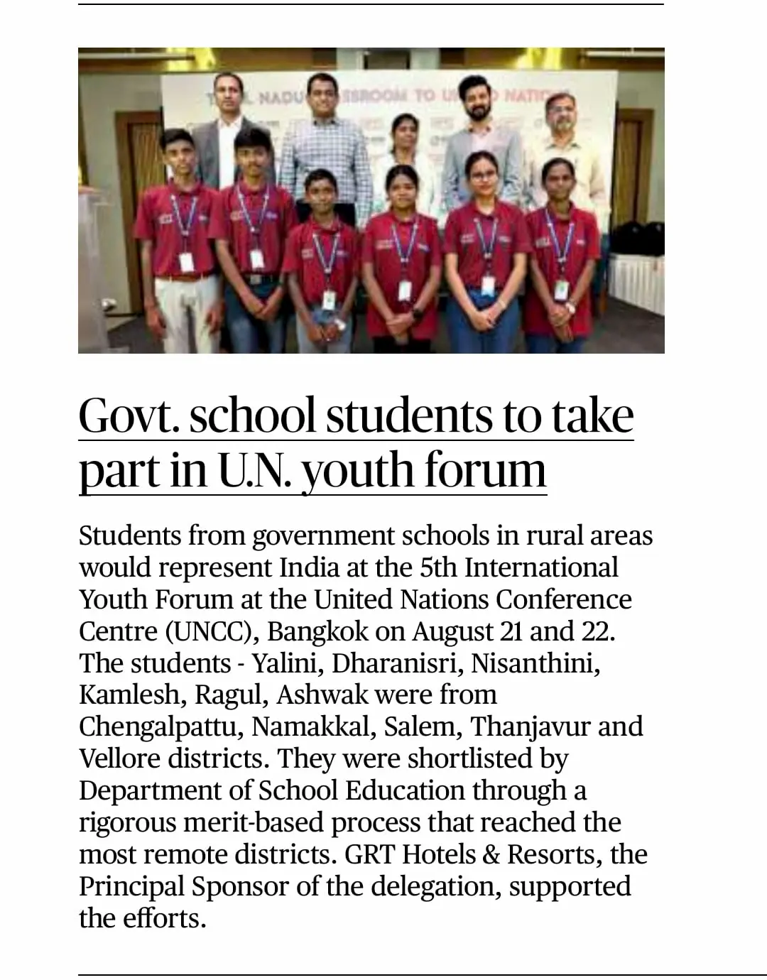 In August 2025, six students from Tamil Nadu government schools became the first rural government school students from India to represent the nation at the 5th International Youth Forum at the UN Conference Centre in Bangkok. Selected through a merit-based process and sponsored by GRT Hotels & Resorts, these students participated in global discussions on Quality Education, Climate Action, and Gender Equality, marking a historic milestone in educational equity and youth empowerment.