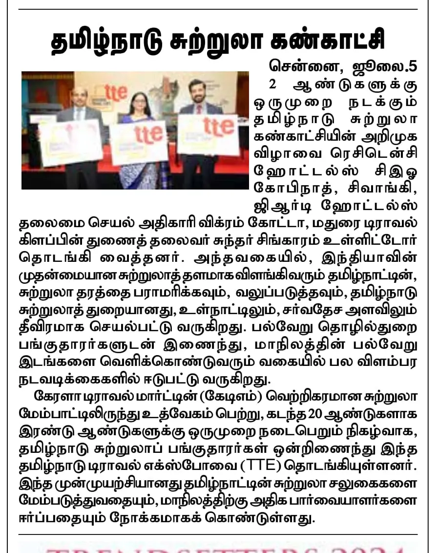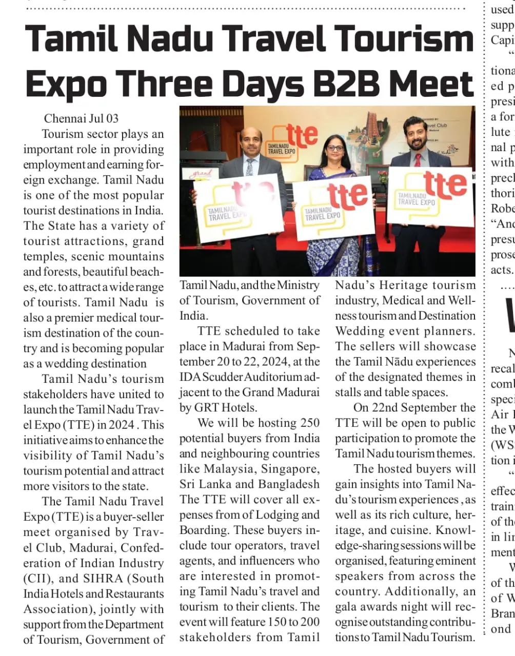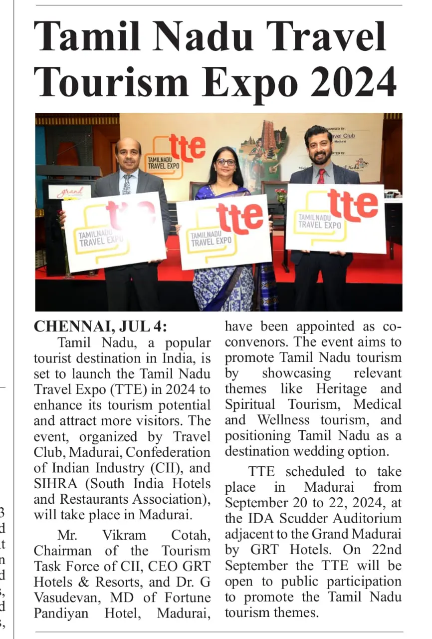 The success of the Tamil Nadu Travel Expo, held from September 20-22, 2024, in Madurai, owes much to the extensive and insightful coverage provided by the press and media. Your reports have helped highlight: