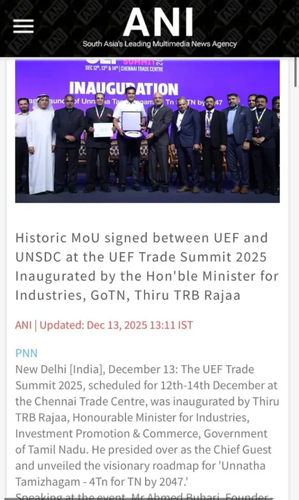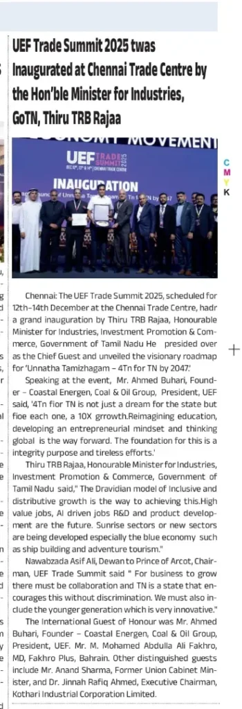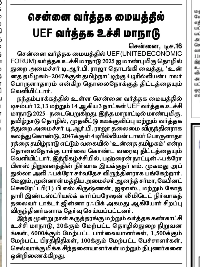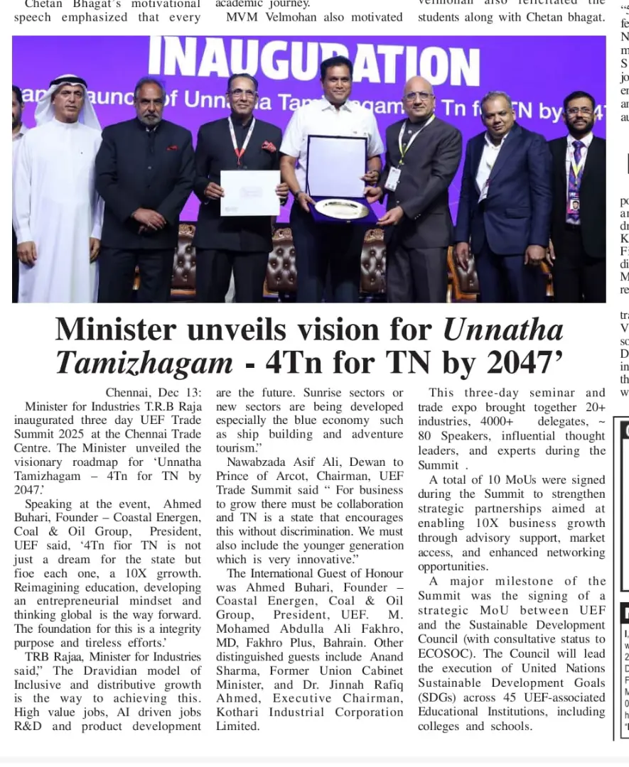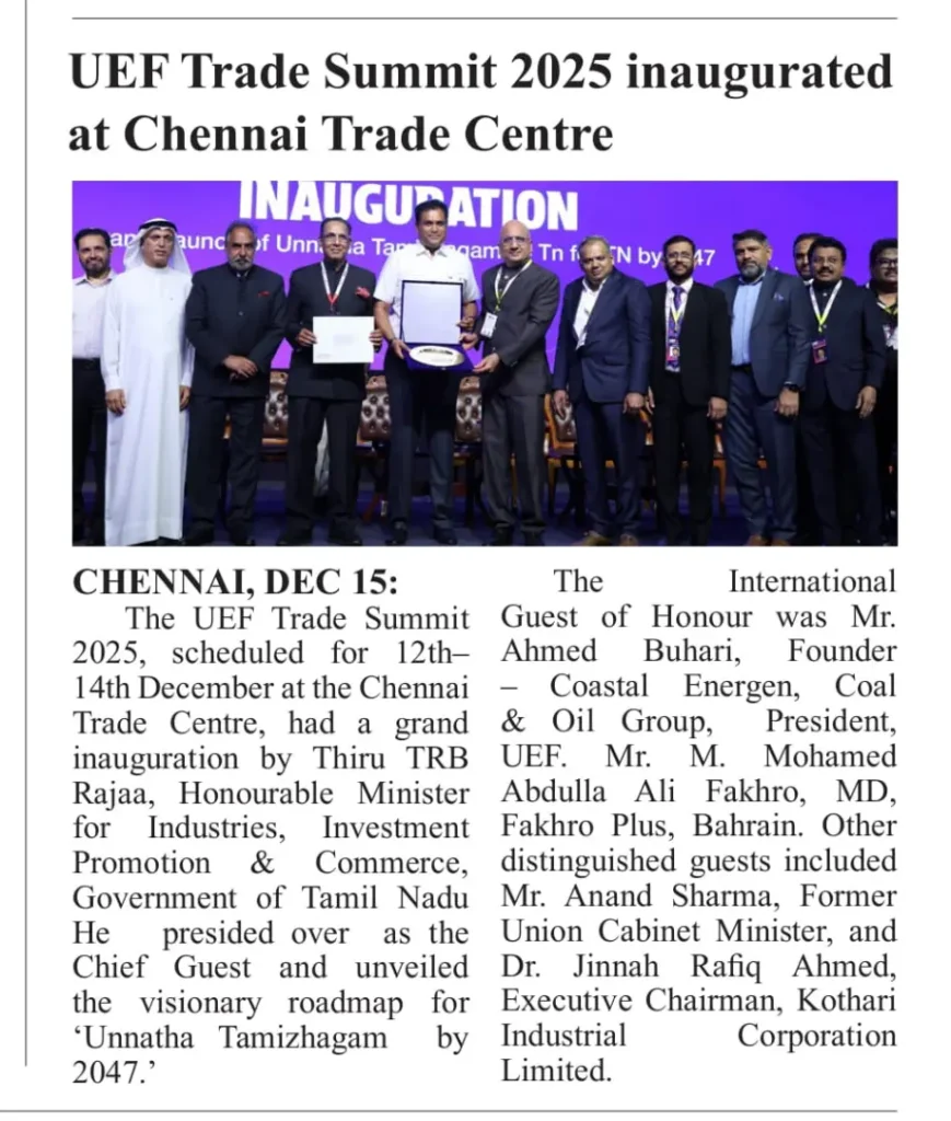 The UEF Trade Summit 2025, held from 12–14 December at the Chennai Trade Centre, was inaugurated by Thiru TRB Rajaa, Hon’ble Minister for Industries, Investment Promotion & Commerce, Government of Tamil Nadu, who unveiled the vision of ‘Unnatha Tamizhagam – 4TN for TN by 2047’. Organised by the United Economic Forum (UEF), the three-day summit brought together 20+ industries, 4,000+ delegates, 80 speakers and 200+ stalls, focusing on inclusive growth, startups, innovation and sustainability.