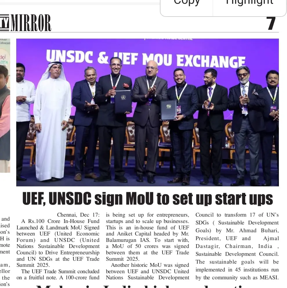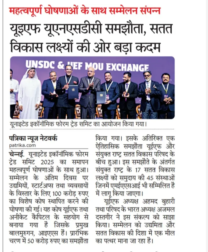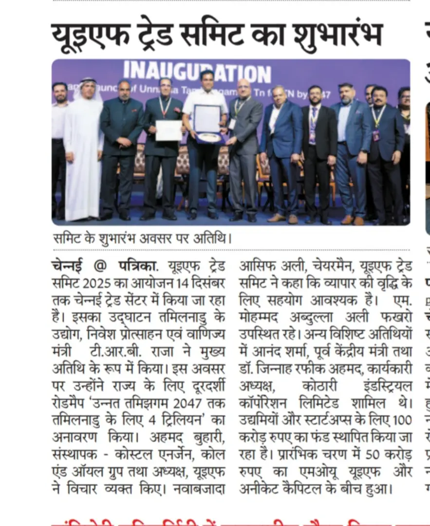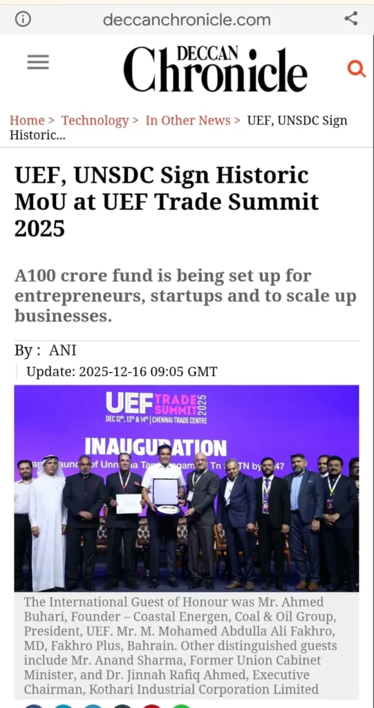 The UEF Trade Summit 2025, held from 12–14 December at the Chennai Trade Centre, was inaugurated by Thiru TRB Rajaa, Hon’ble Minister for Industries, Investment Promotion & Commerce, Government of Tamil Nadu, who unveiled the vision of ‘Unnatha Tamizhagam – 4TN for TN by 2047’. Organised by the United Economic Forum (UEF), the three-day summit brought together 20+ industries, 4,000+ delegates, 80 speakers and 200+ stalls, focusing on inclusive growth, startups, innovation and sustainability.