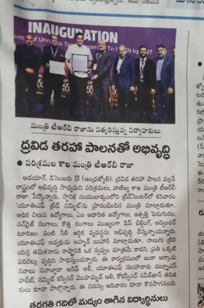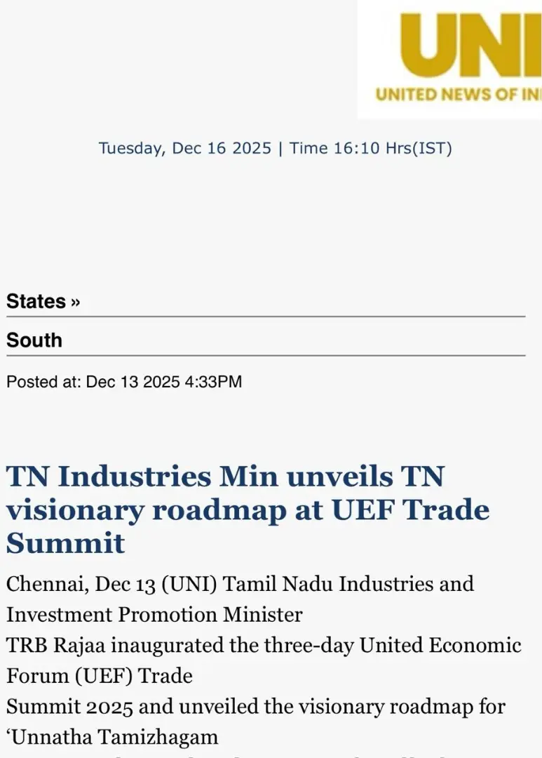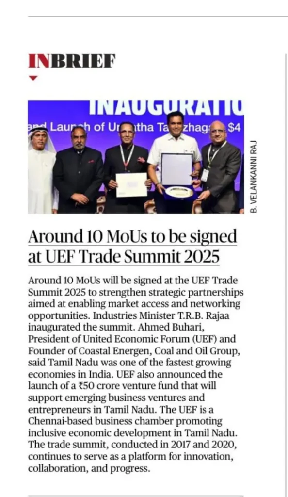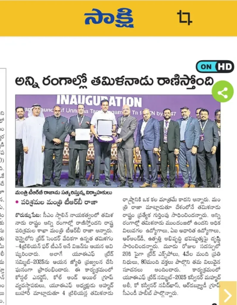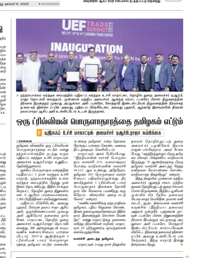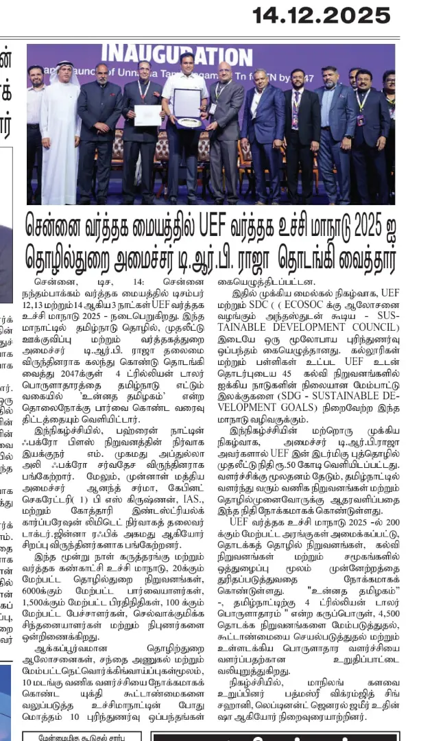 UEF Trade Summit 2025 Inaugurated by Thiru TRB Rajaa, Hon’ble Minister for Industries, GoTN, and Presided Over by Dr. Palanivel Thiagarajan, Hon’ble Minister for IT & Digital Services, GoTN, Showcasing the Vision of ‘Unnatha Tamizhagam – 4TN for TN by 2047’ | Media Coverage