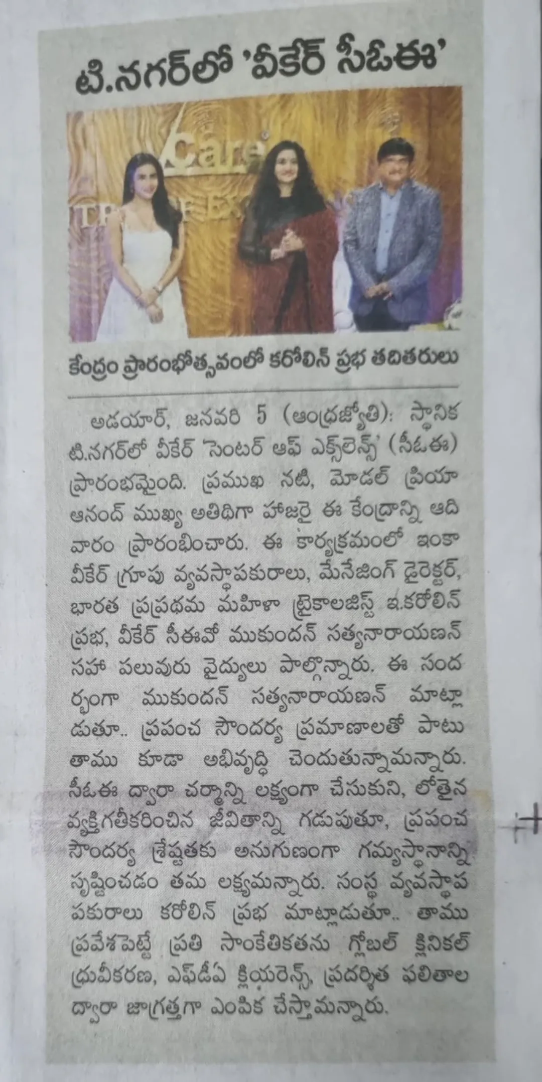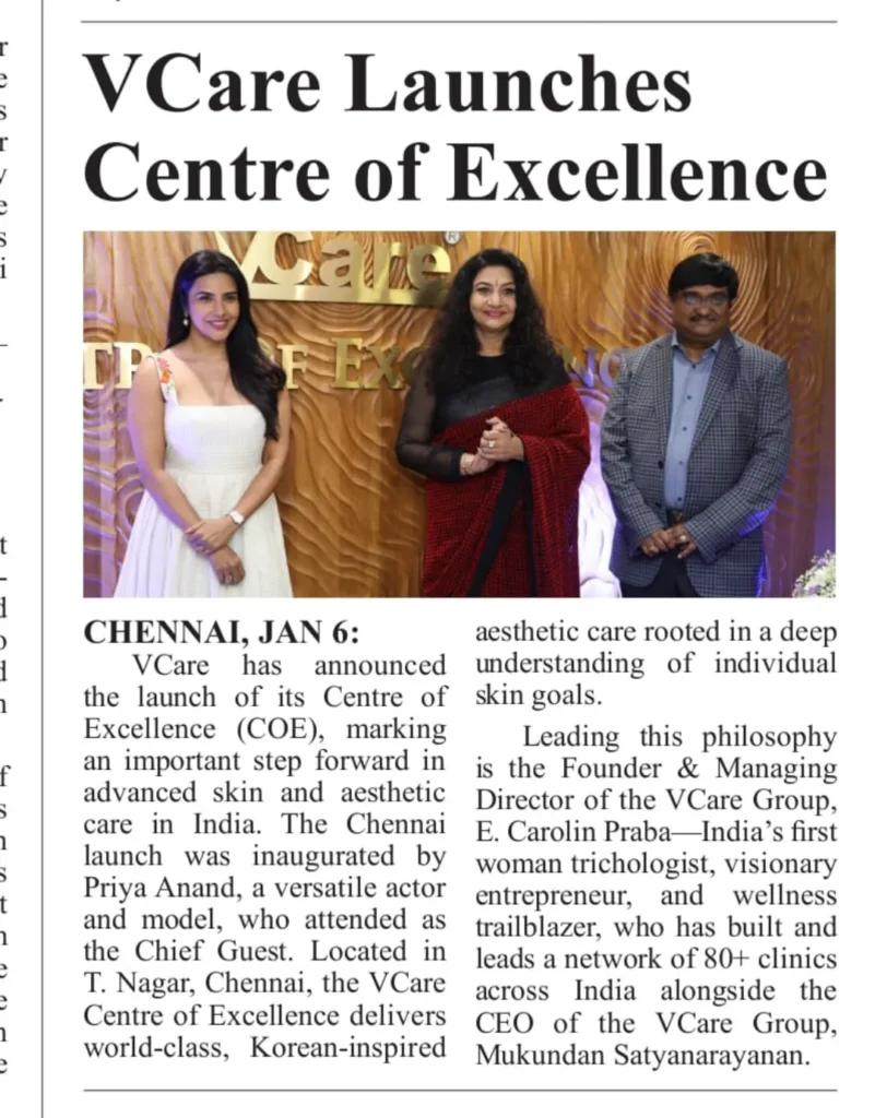 The launch was inaugurated by actor and model Priya Anand, with leading doctors, healthcare professionals, industry experts, and media in attendance. Founded by E. Carolin Praba, India’s first woman trichologist and Founder & Managing Director of the VCare Group, and led alongside CEO Mukundan Satyanarayanan, the centre reflects over two decades of research-driven innovation.