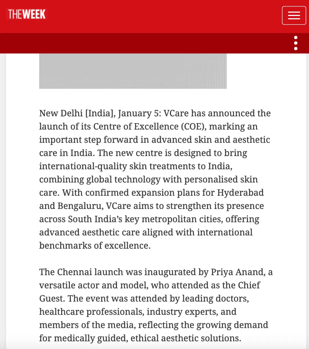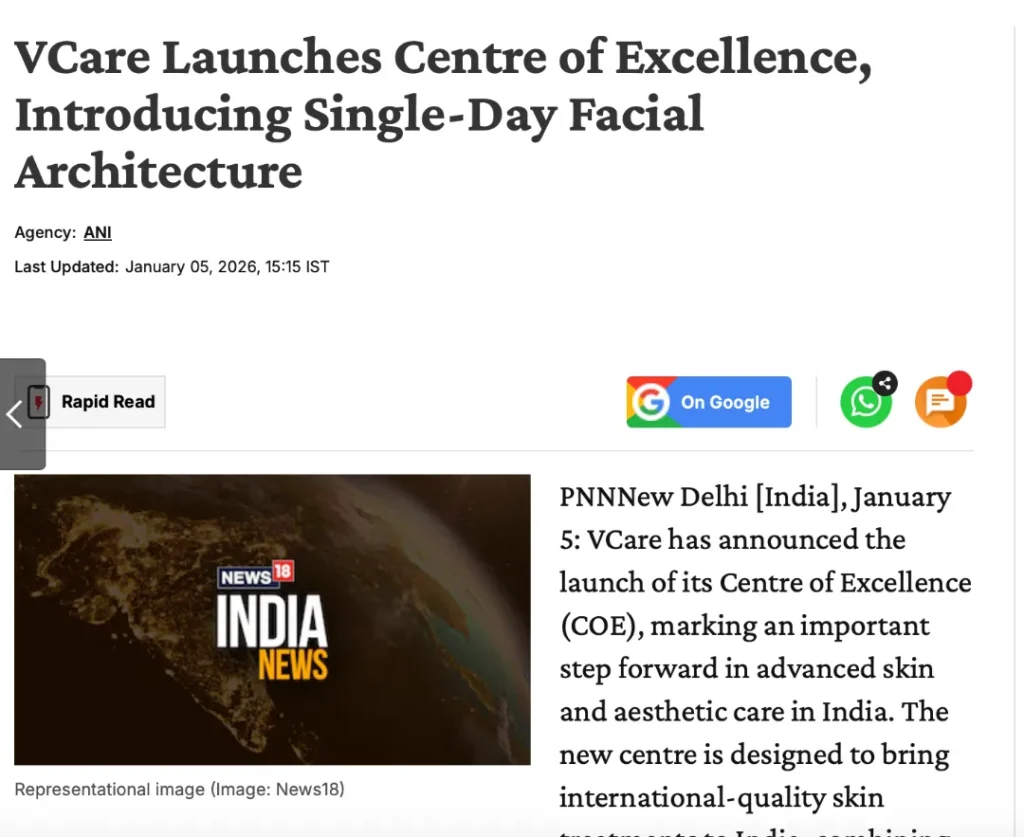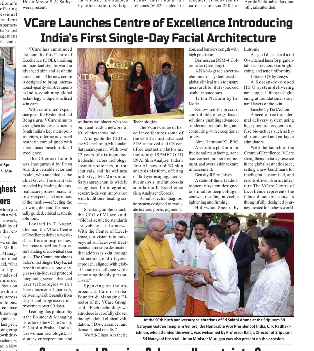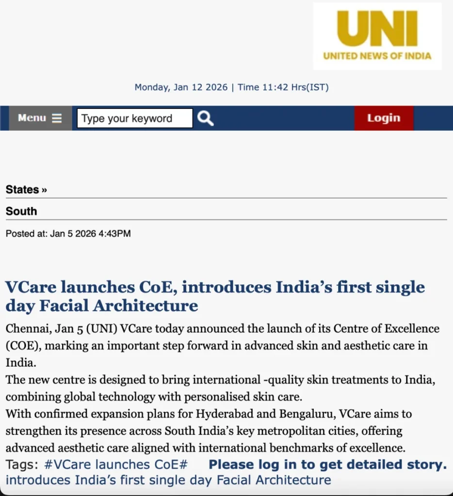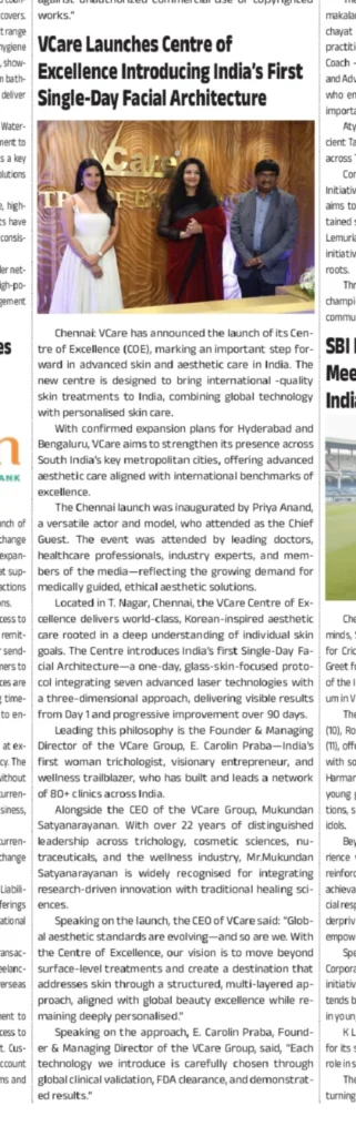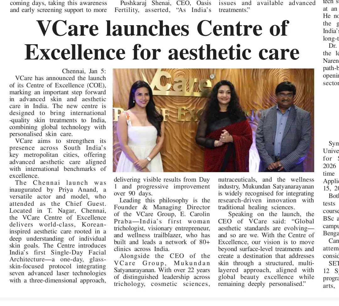 The COE introduces India’s first Single-Day Facial Architecture and features advanced FDA-approved and CE-certified technologies, including AI-powered skin analysis, laser platforms, RF systems, and HIFU. With confirmed expansion plans for Hyderabad and Bengaluru, VCare aims to set new global benchmarks in ethical, results-driven aesthetic care across South India.