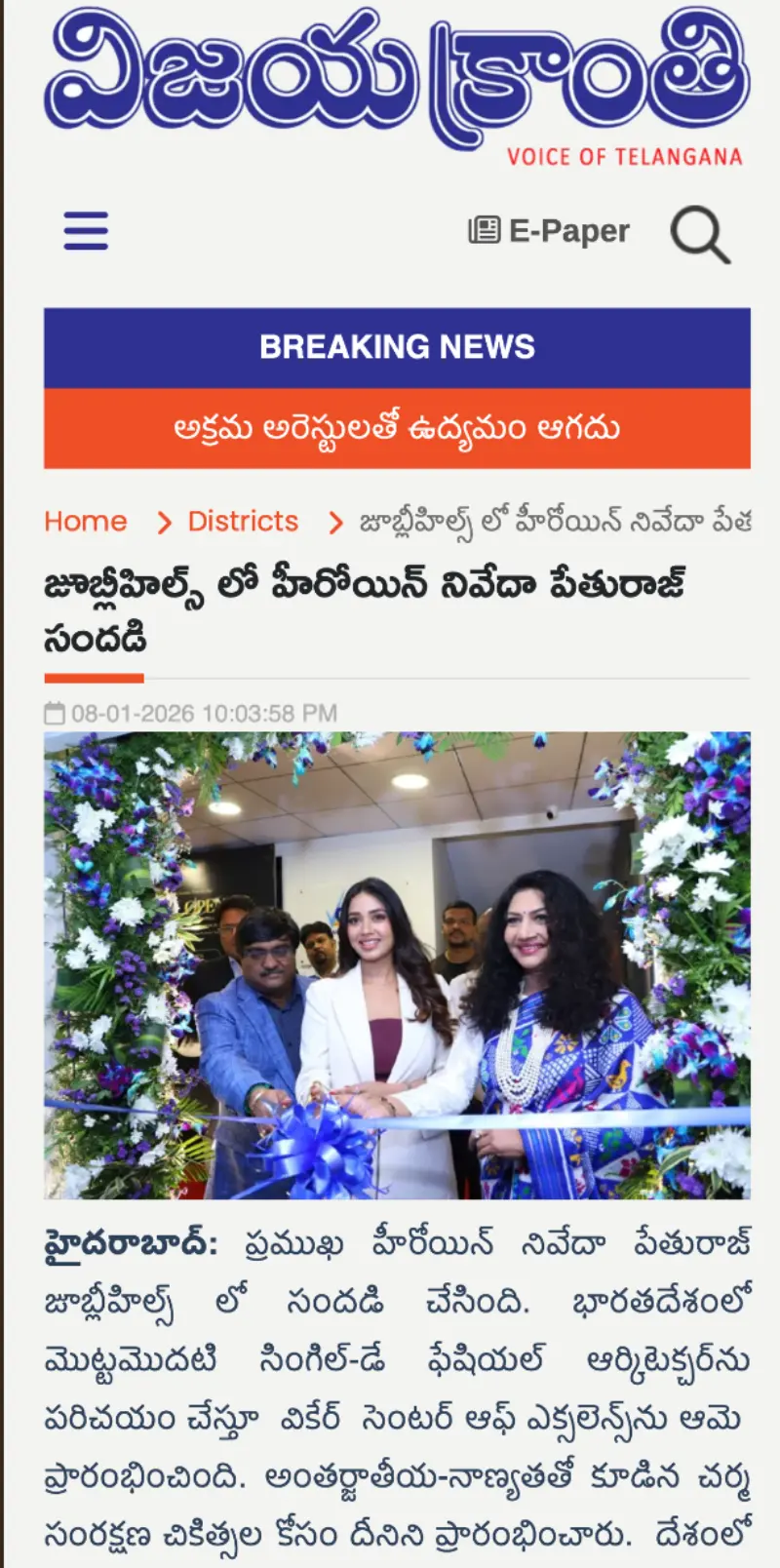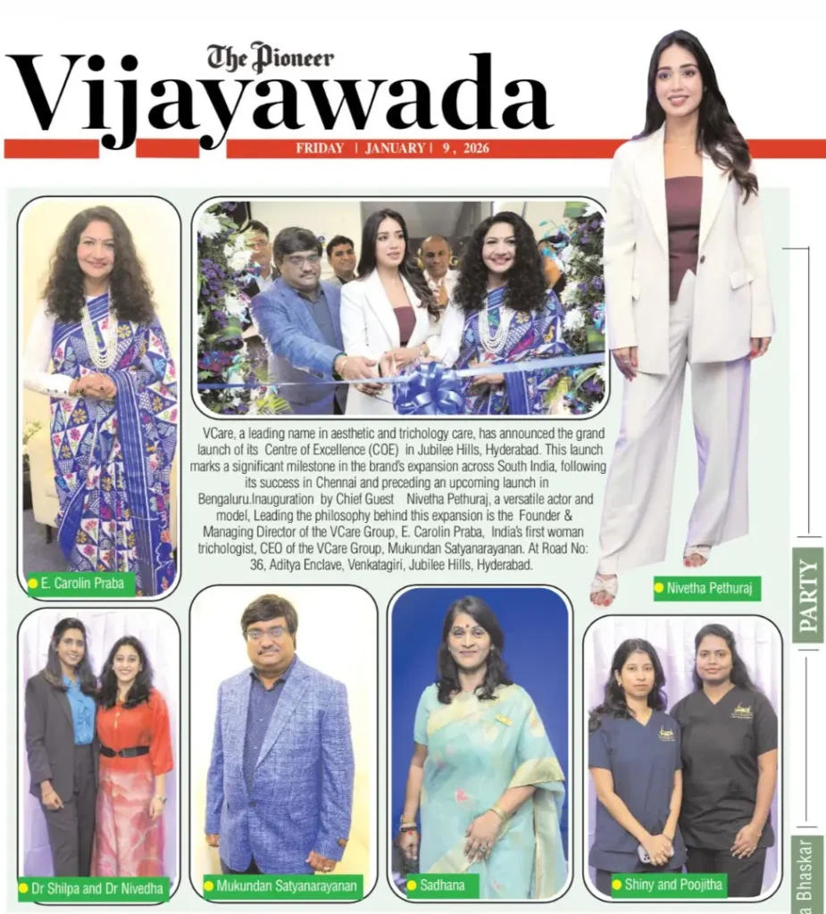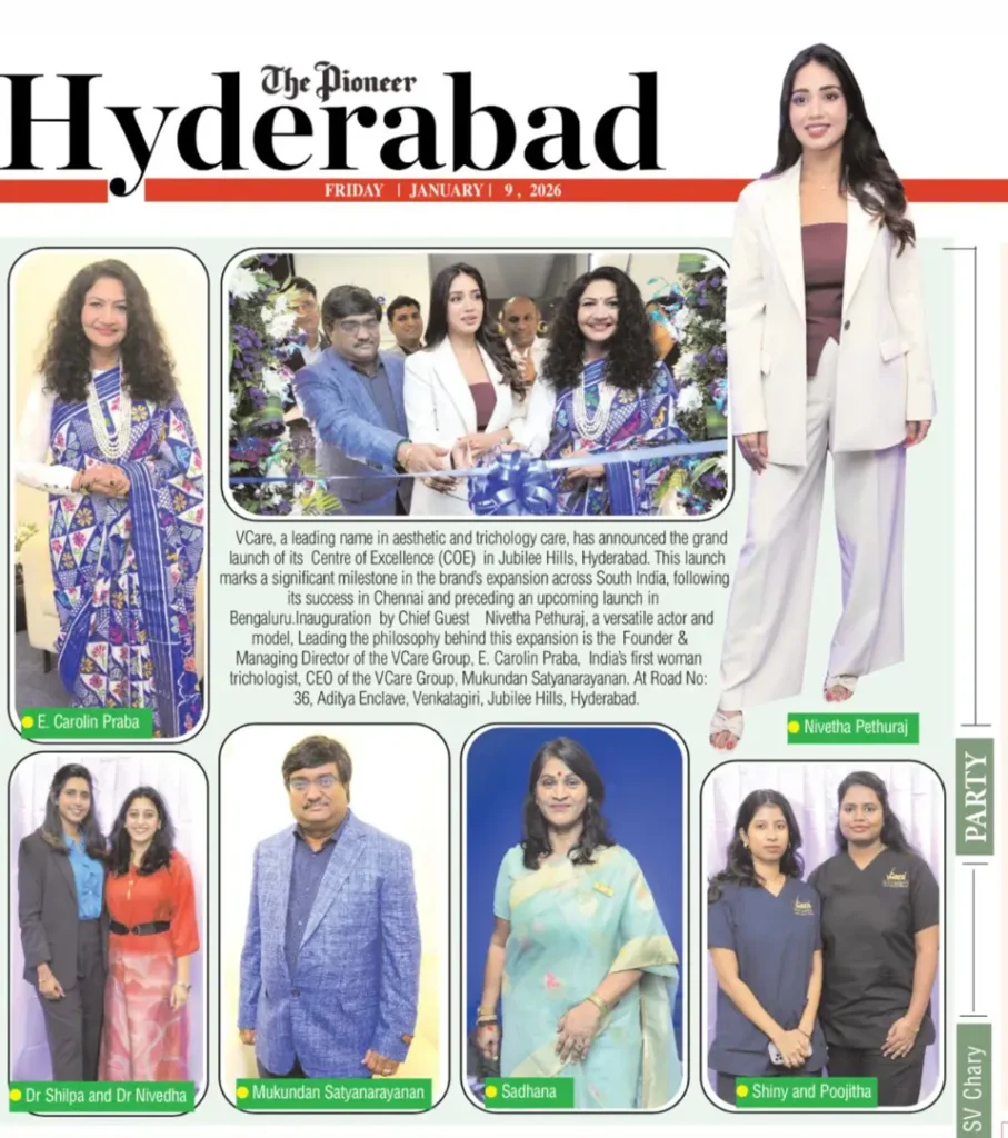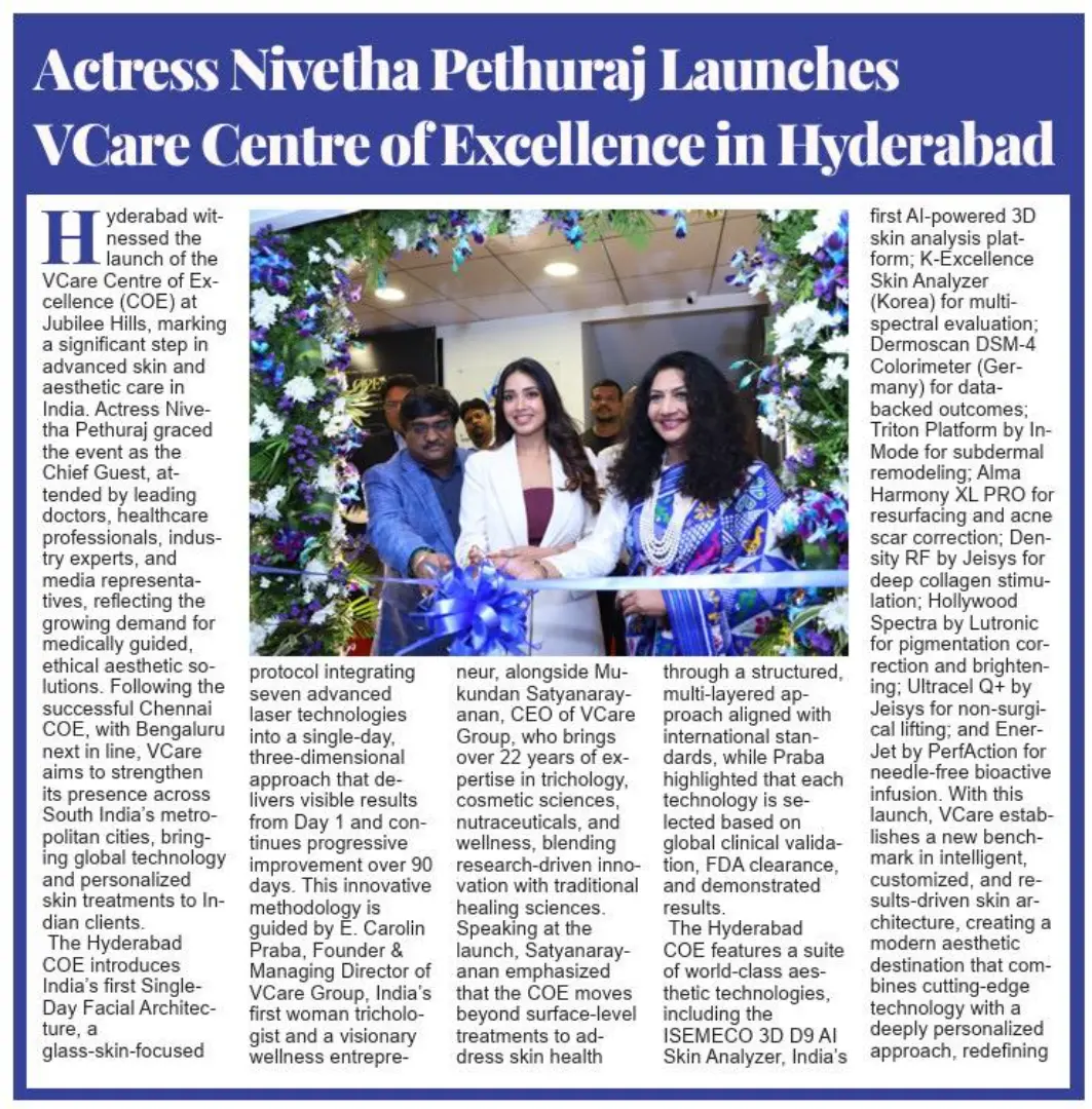 VCare, a leading name in aesthetic and trichology care, has announced the grand launch of its Centre of Excellence (COE) in Jubilee Hills, Hyderabad. This launch marks a significant milestone in the brand’s expansion across South India, following its success in Chennai and Bengaluru.The new facility was inaugurated by Chief Guest Ms. Nivetha Pethuraj, a versatile actor and model, amidst a gathering of leading doctors, healthcare professionals, industry experts, and media representatives.